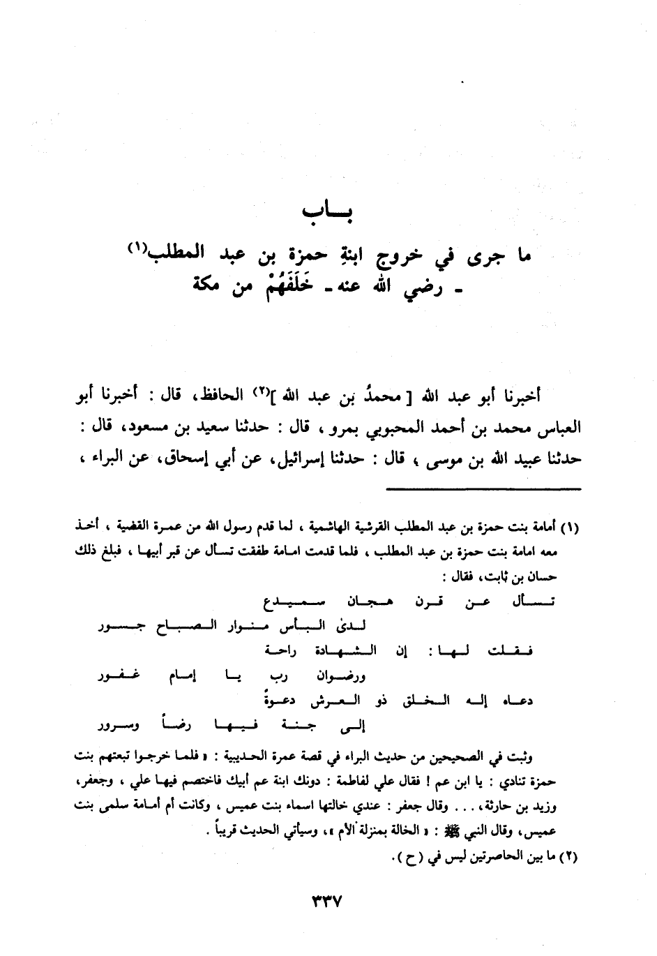 [ (1) ] أمامة بِنْتَ حَمْزَةَ بْنِ عَبْدِ المطلب القرشية الهاشمية، لَمَّا قَدِمَ رَسُولُ اللهِ من عمرة القضية، أخذ معه امامة بِنْتَ حَمْزَةَ بْنِ عَبْدِ المطلب، فلما قدمت امامة طفقت تسأل عن قبر أبيها، فبلغ ذلك حسان بن ثابت، فقال: