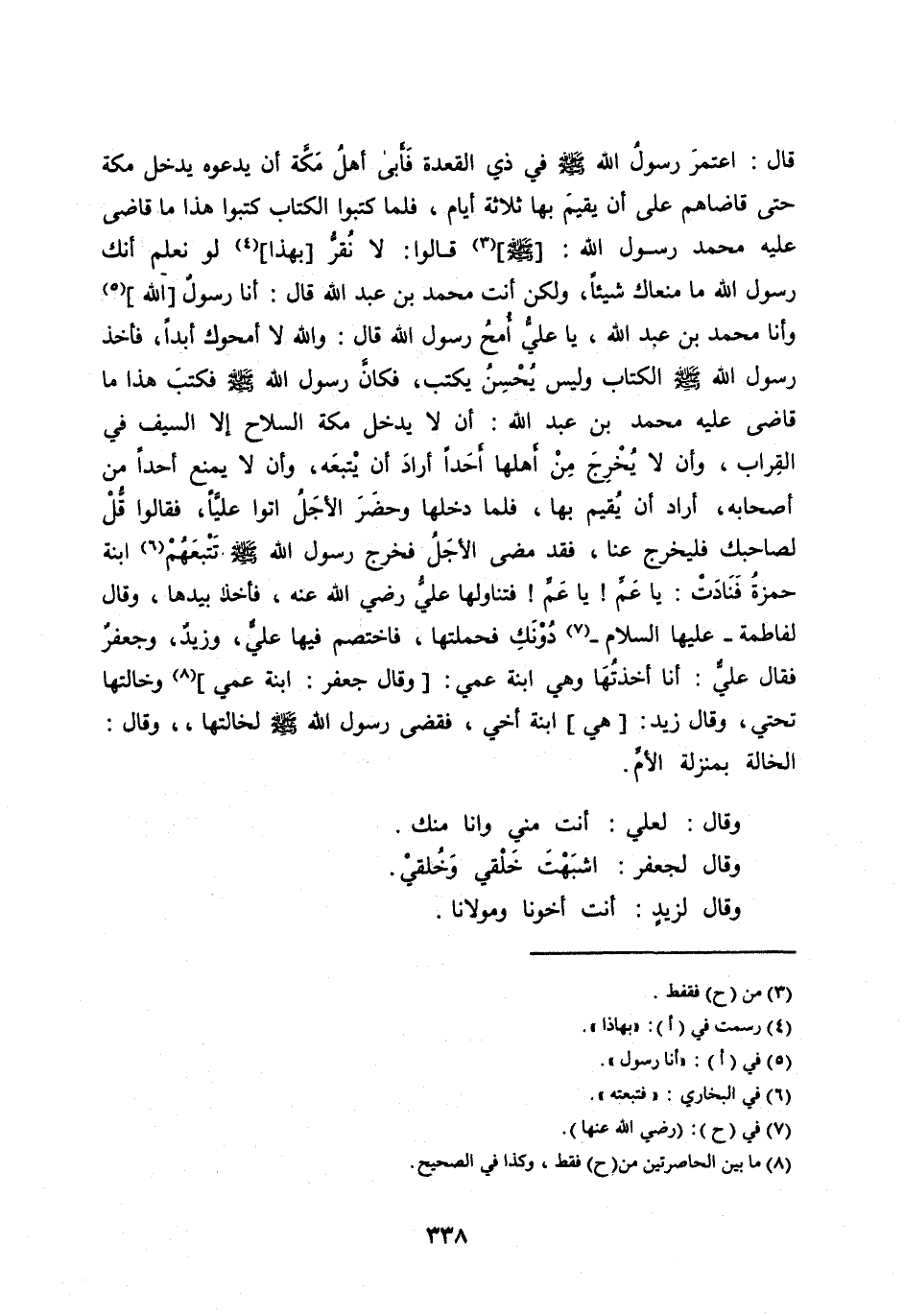 قَالَ: اعْتَمَرَ رَسُولُ اللهِ صَلَّى اللهُ عَلَيْهِ وَسَلَّمَ فِي ذِي الْقَعْدَةِ فَأَبَى أَهْلُ مَكَّةَ أَنْ يَدَعُوهُ يَدْخُلُ مَكَّةَ حَتَّى قَاضَاهُمْ عَلَى أَنْ يُقِيمَ بِهَا ثَلَاثَةَ أَيَّامٍ، فَلَمَّا كَتَبُوا الْكِتَابَ كَتَبُوا هَذَا مَا قَاضَى عَلَيْهِ مُحَمَّدٌ رَسُولُ اللهِ: [صَلَّى اللهُ عَلَيْهِ وَسَلَّمَ] [ (3) ] قَالُوا: لَا نُقِرُّ [بِهَذَا] [ (4) ] لَوْ نَعْلَمُ أَنَّكَ رسول الله ما منعاك شَيْئًا، وَلَكِنْ أَنْتَ مُحَمَّدُ بْنُ عَبْدِ اللهِ قَالَ: أَنَا رَسُولُ [اللهِ] [ (5) ] وَأَنَا مُحَمَّدُ بْنُ عَبْدِ اللهِ، يَا عَلِيُّ امْحُ رَسُولَ اللهِ قَالَ: وَاللهِ لَا أَمْحُوكَ أَبَدًا، فَأَخَذَ رَسُولُ اللهِ صَلَّى الله عليه وَسَلَّمَ الْكِتَابَ وَلَيْسَ يُحْسِنُ يكتب، فَكَانَ رَسُولُ اللهِ صَلَّى اللهُ عَلَيْهِ وَسَلَّمَ فَكَتَبَ هَذَا مَا قَاضَى عَلَيْهِ مُحَمَّدُ بْنُ عَبْدِ اللهِ: أَنْ لَا يَدْخُلَ مَكَّةَ السِّلَاحُ إِلَّا السَّيْفَ فِي الْقِرَابِ، وَأَنْ لَا يُخْرِجَ مِنْ أَهْلِهَا أَحَدًا أَرَادَ أَنْ يَتْبَعَهُ، وَأَنْ لَا يَمْنَعَ أَحَدًا مِنْ أَصْحَابِهِ، أَرَادَ أَنْ يُقِيمَ بِهَا، فَلَمَّا دَخَلَهَا وَحَضَرَ الْأَجَلُ أَتَوْا عَلِيًّا، فَقَالُوا قُلْ لِصَاحِبِكَ فَلْيَخْرُجْ عَنَّا، فَقَدْ مَضَى الْأَجَلُ فَخَرَجَ رَسُولُ اللهِ صَلَّى الله عليه وَسَلَّمَ تَتْبَعَهُمُ [ (6) ] ابْنَةُ حَمْزَةَ فَنَادَتْ: يَا عَمِّ! يَا عَمِّ! فَتَنَاوَلَهَا عَلِيٌّ رَضِيَ اللهُ عَنْهُ، فَأَخَذَ بِيَدِهَا، وَقَالَ لِفَاطِمَةَ- عَلَيْهَا السَّلَامُ-[ (7) ] دُونَكِ فَحَمَلَتْهَا، فَاخْتَصَمَ فِيهَا عَلِيٌّ، وَزَيْدٌ، وَجَعْفَرٌ فَقَالَ عَلِيٌّ: أَنَا أَخَذْتُهَا وَهِيَ ابْنَةُ عَمِّي: [وَقَالَ جَعْفَرٌ: ابْنَةُ عَمِّي] [ (8) ] وَخَالَتُهَا تَحْتِي، وَقَالَ زَيْدٌ: [هِيَ] ابْنَةُ أَخِي، فَقَضَى رَسُولُ اللهِ صلى الله عليه وسلم لِخَالَتِهَا، وَقَالَ: