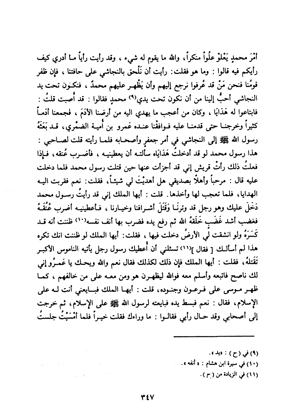 هَذَا رَسُولُ مُحَمَّدٍ لَوْ قَدْ أَدْخَلْتُ هَدَايَاهُ سَأَلْتُهُ أَنْ يُعْطِيَنِيهِ، فَأَضْرِبَ عُنُقَهُ، فَإِذَا فَعَلْتُ ذَلِكَ رَأَتْ قُرَيْشٌ أَنِّي قَدْ أَجْزَأْتُ عَنْهَا حِينَ قَتَلْتُ رَسُولَ مُحَمَّدٍ فَلَمَّا دَخَلْتُ عَلَيْهِ قَالَ: مَرْحَبًا وَأَهْلًا بِصَدِيقِي هَلْ أَهْدَيْتَ لِي شَيْئًا، فَقُلْتُ: نَعَمْ فَقَرَّبْتُ إِلَيْهِ الْهَدَايَا، فَلَمَّا تَعَجَّبَ لَهَا وَأَخَذَهَا. قُلْتُ: أَيُّهَا الْمَلِكُ إِنِّي قَدْ رَأَيْتُ رَسُولَ مُحَمَّدٍ دَخَلَ عَلَيْكَ وَهُوَ رَجُلٌ قَدْ وَتَرَنَا وَقَتَلَ أَشْرَافَنَا وَخِيَارَنَا، فَأَعْطِنِيهِ أَضْرِبْ عُنُقَهُ فَغَضِبَ أَشَدَّ غَضَبٍ خَلَقَهُ اللهُ ثُمَّ رَفَعَ يَدَهُ فَضَرَبَ بِهَا أَنْفَ نَفْسِهِ [ (10) ] ظَنَنْتُ أَنَّهُ قَدْ كَسَرَهُ وَلَوِ انْشَقَّتْ لِيَ الْأَرْضُ دَخَلْتُ فِيهَا، فَقُلْتُ: أَيُّهَا الْمَلِكُ لَوْ ظَنَنْتُ أَنَّكَ تَكْرَهُ هَذَا لَمْ أسألك [فقال] [ (11) ] تسئلني أَنْ أُعْطِيَكَ رَسُولَ رَجُلٍ يَأْتِيهِ النَّامُوسُ الْأَكْبَرُ تَقْتُلَهُ، فَقُلْتُ: أَيُّهَا الْمَلِكُ فَإِنَّ ذَلِكَ لَكَذَلِكَ فَقَالَ نَعَمْ وَاللهِ وَيْحَكَ يَا عَمْرُو إِنِّي لَكَ نَاصِحٌ فَاتَّبِعْهُ وأسلم معه فو الله لَيَظْهَرَنَّ هُوَ وَمَنْ مَعَهُ عَلَى مَنْ خَالَفَهُمْ، كَمَا ظَهَرَ مُوسَى عَلَى فِرْعَوْنَ وَجُنُودِهِ، قُلْتُ: أَيُّهَا الْمَلِكُ فَبَايِعْنِي أَنْتَ لَهُ عَلَى الْإِسْلَامِ، فَقَالَ: نَعَمْ فَبَسَطَ يَدَهُ فَبَايَعْتُهُ لِرَسُولِ اللهِ صَلَّى اللهُ عَلَيْهِ وَسَلَّمَ عَلَى الْإِسْلَامِ، ثُمَّ خَرَجْتُ إِلَى أَصْحَابِي وَقَدْ حَالَ رَأْيِي فَقَالُوا: مَا وَرَاءَكَ فَقُلْتُ خَيْرًا فَلَمَّا أَمْسَيْتُ جلست