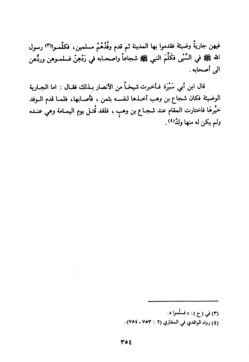 قَالَ ابْنُ أَبِي سَبْرَةَ فَأَخْبَرْتُ شَيْخًا مِنَ الْأَنْصَارِ بِذَلِكَ فَقَالَ: أَمَّا الْجَارِيَةُ الْوَضِيئَةُ فَكَانَ شُجَاعُ بْنُ وَهْبٍ أَخَذَهَا لِنَفْسِهِ بِثَمَنٍ، فَأَصَابَهَا، فَلَمَّا قَدِمَ الْوَفْدُ خَيَّرَهَا فَاخْتَارَتِ الْمُقَامَ عِنْدَ شُجَاعِ بْنِ وَهْبٍ، فَلَقَدْ قُتِلَ يَوْمَ الْيَمَامَةِ وَهِيَ عِنْدَهُ وَلَمْ يَكُنْ له منها ولد [ (4) ] .
