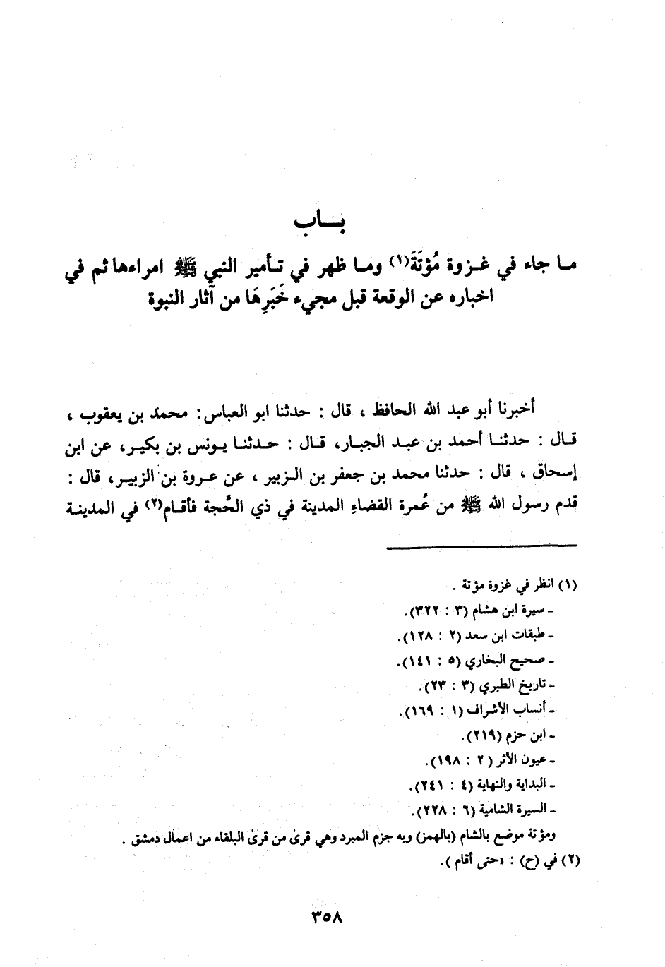 بَابُ مَا جَاءَ فِي غَزْوَةِ مُؤْتَةَ [ (1) ] وَمَا ظَهَرَ فِي تَأْمِيرِ النَّبِيِّ صَلَّى اللهُ عَلَيْهِ وَسَلَّمَ أُمَرَاءَها ثُمَّ فِي إِخْبَارِهِ عَنِ الْوَقْعَةِ قَبْلَ مَجِيءِ خَبَرِهَا مِنْ آثَارِ النُّبُوَّةِ