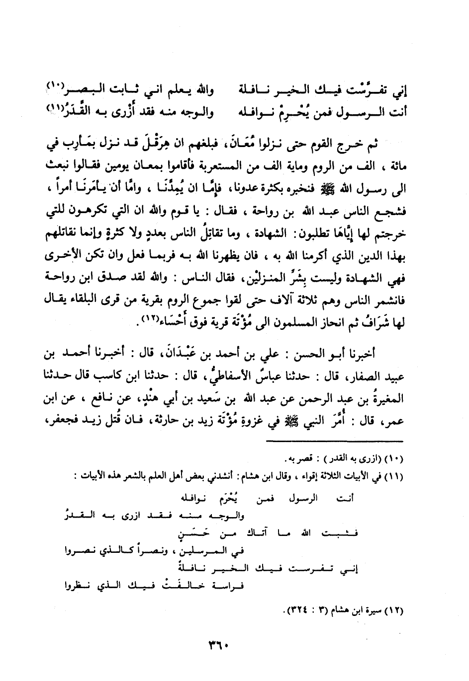 ثُمَّ خَرَجَ الْقَوْمُ حَتَّى نَزَلُوا مَعَانَ، فَبَلَغَهُمْ أَنَّ هِرَقْلَ قَدْ نَزَلَ بِمَأْرِبَ فِي مِائَةِ، أَلْفٍ مِنَ الروم وماية أَلْفٍ مِنَ الْمُسْتَعْرِبَةِ فَأَقَامُوا بِمُعَانَ يَوْمَيْنِ فَقَالُوا نَبْعَثُ إِلَى رَسُولِ اللهِ صَلَّى اللهُ عَلَيْهِ وَسَلَّمَ فَنُخْبِرُهُ بِكَثْرَةِ عَدُوِّنَا، فَإِمَّا أَنْ يُمِدَّنَا، وَإِمَّا أَنْ يَأْمُرَنَا أَمْرًا، فَشَجَّعَ النَّاسَ عَبْدُ اللهِ بْنُ رَوَاحَةَ، فَقَالَ: يَا قَوْمِ وَاللهِ إِنَّ الَّتِي تَكْرَهُونَ لَلَّتِي خَرَجْتُمْ لَهَا إِيَّاهَا تَطْلُبُونَ: الشَّهَادَةُ، وما تقاتل النَّاسَ بِعَدَدٍ وَلَا كَثْرَةٍ وَإِنَّمَا نُقَاتِلُهُمْ بِهَذَا الدِّينِ الَّذِي أَكْرَمَنَا اللهُ بِهِ، فَإِنْ يُظْهِرْنَا اللهُ بِهِ فَرُبَّمَا فَعَلَ وَإِنْ تَكُنِ الْأُخْرَى فَهِيَ الشَّهَادَةُ وَلَيْسَتْ بِشَرِّ الْمَنْزِلَيْنِ، فَقَالَ النَّاسُ: وَاللهِ لَقَدْ صَدَقَ ابْنُ رَوَاحَةَ فَانْشَمَرَ النَّاسُ وَهُمْ ثَلَاثَةُ آلَافٍ حَتَّى لَقُوا جُمُوعَ الرُّومِ بِقَرْيَةٍ مِنْ قُرَى الْبَلْقَاءِ يُقَالُ لَهَا شَرَافٌ ثُمَّ انْحَازَ الْمُسْلِمُونَ إِلَى مُؤْتَةَ قَرْيَةٌ فَوْقَ أَحْسَاءَ [ (12) ] .