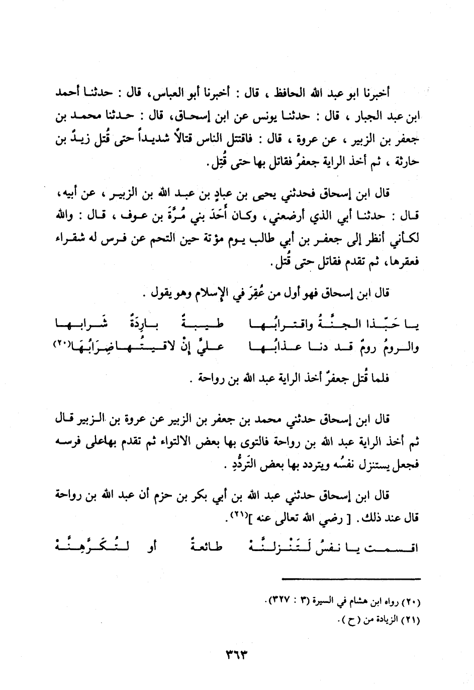 قَالَ ابْنُ إِسْحَاقَ حَدَّثَنِي مُحَمَّدُ بْنُ جَعْفَرِ بْنِ الزُّبَيْرِ عَنْ عُرْوَةَ بْنِ الزُّبَيْرِ قَالَ ثُمَّ أَخَذَ الرَّايَةَ عَبْدُ اللهِ بْنُ رَوَاحَةَ فَالْتَوَى بِهَا بَعْضَ الِالْتِوَاءِ ثُمَّ تَقَدَّمَ بِهَا عَلَى فَرَسِهِ فَجَعَلَ يَسْتَنْزِلُ نَفْسَهُ وَيَتَرَدَّدُ بِهَا بَعْضَ التَّرَدُّدِ.