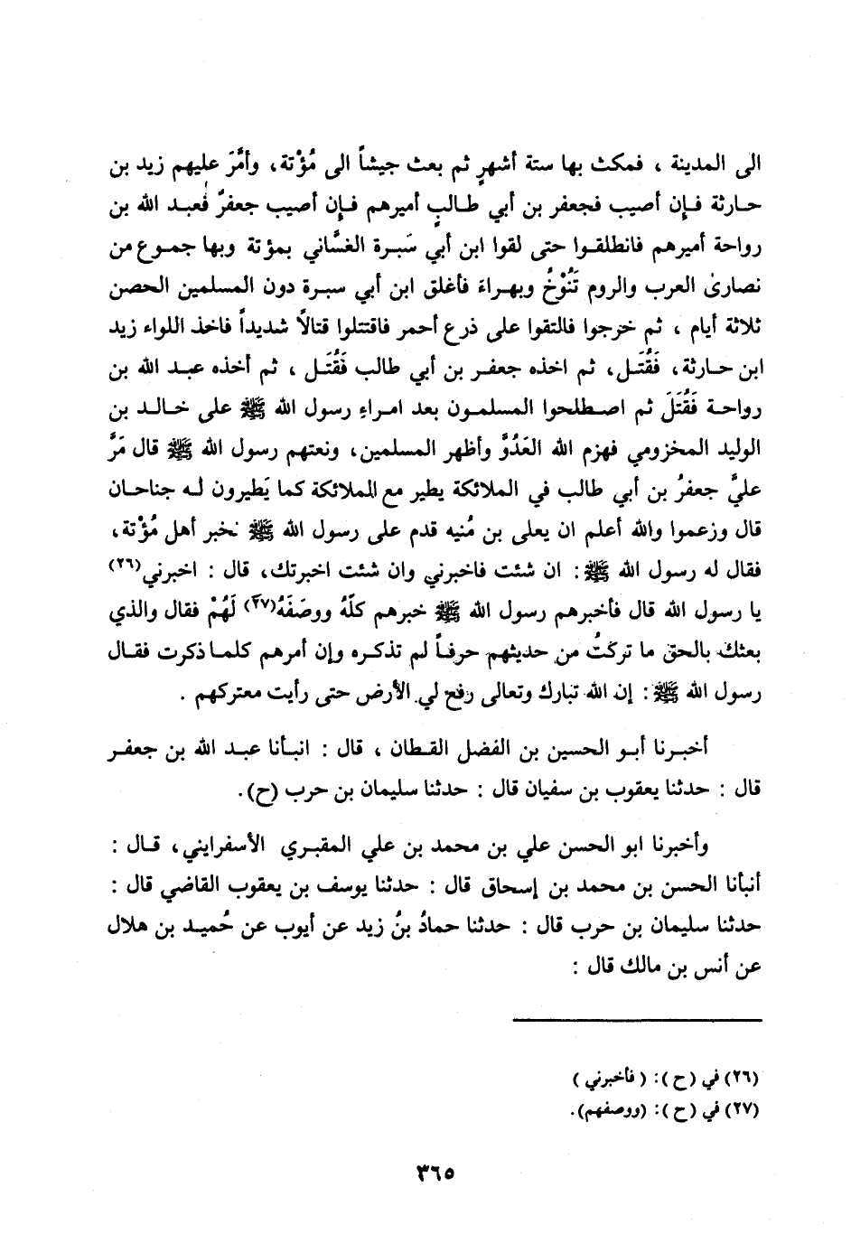 إِلَى الْمَدِينَةِ، فَمَكَثَ بِهَا سِتَّةَ أَشْهُرٍ ثُمَّ بَعَثَ جَيْشًا إِلَى مُؤْتَةَ، وَأَمَّرَ عَلَيْهِمْ زَيْدَ بْنَ حَارِثَةَ فَإِنْ أُصِيبَ فَجَعْفَرُ بْنُ أَبِي طَالِبٍ أَمِيرُهُمْ فَإِنْ أُصِيبَ جَعْفَرٌ فَعَبْدُ اللهِ بْنُ رَوَاحَةَ أَمِيرُهُمْ فَانْطَلَقُوا حَتَّى لَقُوا ابْنَ أَبِي سَبْرَةَ الْغَسَّانِيَّ بِمُؤتَةَ وَبِهَا جُمُوعٌ مِنْ نَصَارَى الْعَرَبِ وَالرُّومِ تَنُوخَ وَبَهْرَاءَ فَأَغْلَقَ ابْنُ أَبِي سَبْرَةَ دُونَ الْمُسْلِمِينَ الْحِصْنَ ثَلَاثَةَ أَيَّامٍ، ثُمَّ خَرَجُوا فَالْتَقَوْا عَلَى ذَرْعٍ أَحْمَرَ فَاقْتَتَلُوا قِتَالًا شَدِيدًا فَأَخَذَ اللِّوَاءَ زَيْدُ ابن حَارِثَةَ، فَقُتِلَ، ثُمَّ أَخَذَهُ جَعْفَرُ بْنُ أَبِي طَالِبٍ فَقُتِلَ، ثُمَّ أَخَذَهُ عَبْدُ اللهِ بْنُ رَوَاحَةَ فَقُتِلَ ثم اصطلحوا الْمُسْلِمُونَ بَعْدَ أُمَرَاءِ رَسُولِ اللهِ صَلَّى اللهُ عليه وَسَلَّمَ عَلَى خَالِدِ بْنِ الْوَلِيدِ الْمَخْزُومِيِّ فَهَزَمَ اللهُ الْعَدُوَّ وَأَظْهَرَ الْمُسْلِمِينَ، وَنَعَتَهُمْ رسول الله صلى الله عَلَيْهِ وَسَلَّمَ قَالَ مَرَّ عَلَيَّ جَعْفَرُ بْنُ أَبِي طَالِبٍ فِي الْمَلَائِكَةِ يَطِيرُ مَعَ الْمَلَائِكَةِ كَمَا يَطِيرُونَ لَهُ جَنَاحَانِ قَالَ وَزَعَمُوا وَاللهُ أَعْلَمُ أَنَّ يَعْلَى بْنَ مُنْيَةَ قَدِمَ عَلَى رَسُولِ اللهِ صَلَّى اللهُ عَلَيْهِ وسلم نخبر أَهْلِ مُؤْتَةَ، فَقَالَ لَهُ رَسُولُ اللهِ صَلَّى اللهُ عَلَيْهِ وَسَلَّمَ: إِنْ شِئْتَ فَأَخْبِرْنِي وَإِنْ شِئْتَ أَخْبَرْتُكَ، قَالَ: أَخْبِرْنِي [ (26) ] يَا رَسُولَ اللهِ قَالَ فَأَخْبَرَهُمْ رَسُولُ اللهِ صَلَّى اللهُ عَلَيْهِ وَسَلَّمَ خَبَرَهُمْ كُلَّهُ وَوَصَفَهُ [ (27) ] لَهُمْ فَقَالَ وَالَّذِي بَعَثَكَ بِالْحَقِّ مَا تَرَكْتَ مِنْ حَدِيثِهِمْ حَرْفًا لَمْ تَذْكُرْهُ وإن أمرهم كلما ذَكَرْتَ فَقَالَ رَسُولُ اللهِ صَلَّى اللهُ عَلَيْهِ وسلم: إِنَّ اللهَ تَبَارَكَ وَتَعَالَى رَفَعَ لِيَ الْأَرْضَ حَتَّى رَأَيْتُ مُعْتَرَكَهُمْ.