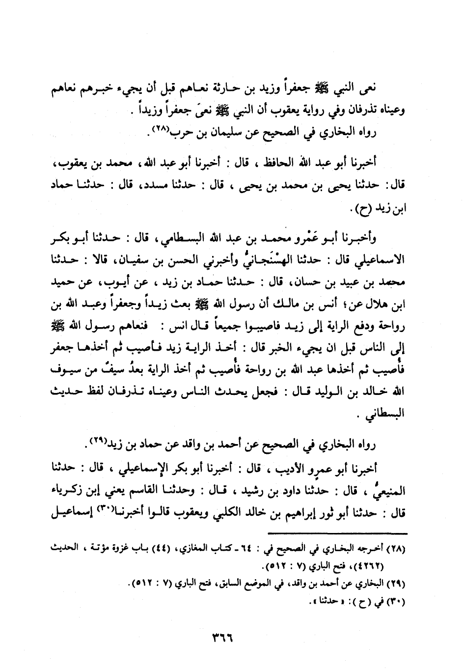 وأَخْبَرَنَا أَبُو عَمْرٍو مُحَمَّدُ بْنُ عَبْدِ اللهِ الْبِسْطَامِيُّ، قَالَ: حَدَّثَنَا أَبُو بَكْرٍ الْإِسْمَاعِيلِيُّ قَالَ: حَدَّثَنَا الْهِسِنْجَانِيُّ وَأَخْبَرَنِي الْحَسَنُ بْنُ سُفْيَانَ، قَالَا: حَدَّثَنَا مُحَمَّدُ بْنُ عُبَيْدِ بْنِ حَسَّانَ، قَالَ: حَدَّثَنَا حَمَّادُ بْنُ زَيْدٍ، عَنْ أَيُّوبَ، عَنْ حميد ابن هِلَالٍ عَنْ، أَنَسِ بْنِ مَالِكٍ أَنَّ رَسُولَ اللهِ صلى اللهُ عَلَيْهِ وَسَلَّمَ بَعَثَ زَيْدًا وَجَعْفَرًا وَعَبْدَ اللهِ بْنَ رَوَاحَةَ وَدَفَعَ الرَّايَةَ إِلَى زَيْدٍ فَأُصِيبُوا جَمِيعًا قَالَ أَنَسٌ: فَنَعَاهُمْ رسول الله صلى الله عَلَيْهِ وَسَلَّمَ إِلَى النَّاسِ قَبْلَ أَنْ يَجِيءَ الْخَبَرُ قَالَ: أَخَذَ الرَّايَةَ زَيْدٌ فَأُصِيبَ ثُمَّ أَخَذَهَا جَعْفَرٌ فَأُصِيبَ ثُمَّ أَخَذَهَا عَبْدُ اللهِ بْنُ رَوَاحَةَ فَأُصِيبَ ثُمَّ أَخَذَ الرَّايَةَ بَعْدُ سَيْفٌ مِنْ سُيوفِ اللهِ خَالِدُ بْنُ الْوَلِيدِ قال: فَجَعَلَ يُحَدِّثُ النَّاسَ وَعَيْنَاهُ تذرفان لفظ حديث البسطاني.