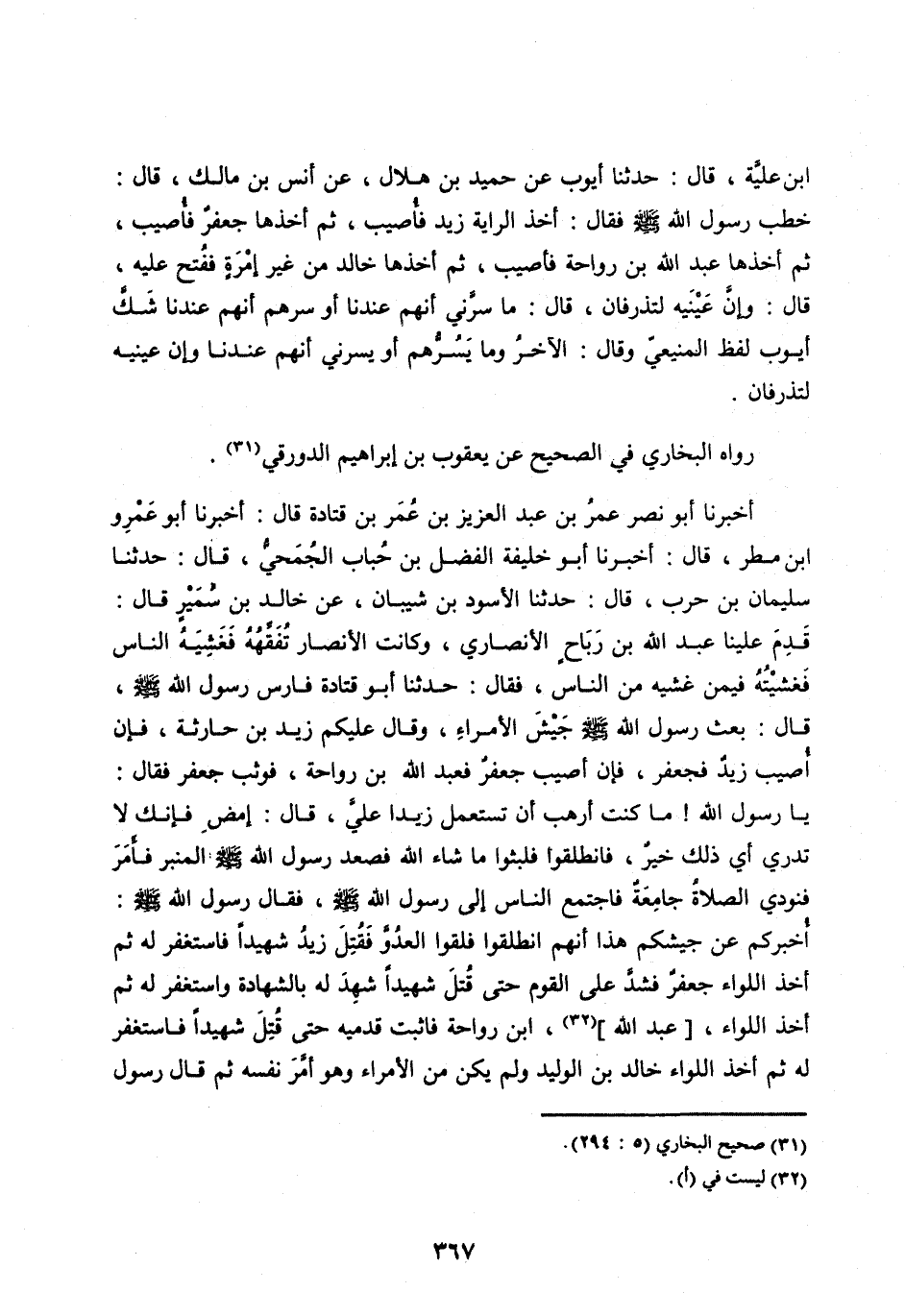 ابْنُ عُلَيَّةَ، قَالَ: حَدَّثَنَا أَيُّوبُ عَنْ حُمَيْدِ بْنُ هِلَالٍ، عَنْ أَنَسِ بْنِ مَالِكٍ، قَالَ: خَطَبَ رَسُولُ اللهِ صَلَّى اللهُ عَلَيْهِ وَسَلَّمَ فَقَالَ: أَخَذَ الرَّايَةَ زَيْدٌ فَأُصِيبَ، ثُمَّ أَخَذَهَا جَعْفَرٌ فَأُصِيبَ، ثُمَّ أَخَذَهَا عَبْدُ اللهِ بْنُ رَوَاحَةَ فَأُصِيبَ، ثُمَّ أَخَذَهَا خَالِدٌ مِنْ غَيْرِ إِمْرَةٍ فَفُتِحَ عَلَيْهِ، قَالَ: وَإِنَّ عَيْنَيْهِ لَتَذْرِفَانِ، قَالَ: مَا سَرَّنِي أَنَّهُمْ عِنْدَنَا أَوْ سَرَّهُمْ أَنَّهُمْ عِنْدَنَا شَكَّ أَيُّوبُ لَفْظُ الْمَنِيعِيِّ وَقَالَ: الْآخَرُ وَمَا يَسُرُّهُمْ أَوْ يَسُرُّنِي أَنَّهُمْ عِنْدَنَا وَإِنَّ عَيْنَيْهِ لَتَذْرِفَانِ.