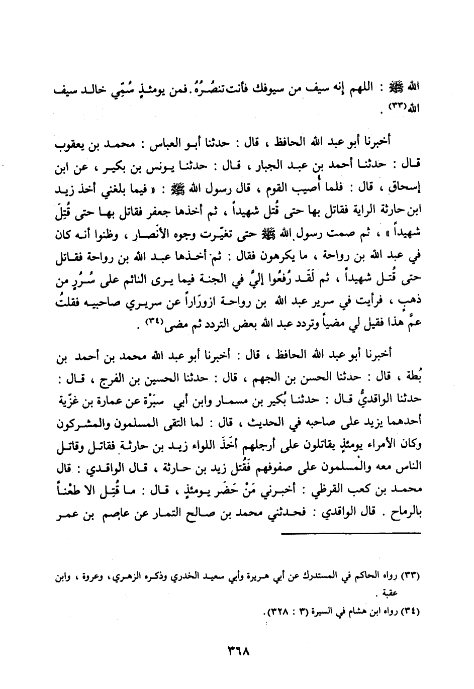 أَخْبَرَنَا أَبُو عَبْدِ اللهِ الْحَافِظُ، قَالَ: حَدَّثَنَا أَبُو الْعَبَّاسِ: مُحَمَّدُ بْنُ يَعْقُوبَ قَالَ: حَدَّثَنَا أَحْمَدُ بْنُ عَبْدِ الْجَبَّارِ، قَالَ: حَدَّثَنَا يُونُسُ بْنُ بُكَيْرٍ، عَنِ ابْنِ إِسْحَاقَ، قَالَ: فَلَمَّا أُصِيبَ الْقَوْمُ، قَالَ رَسُولُ اللهِ صَلَّى اللهُ عَلَيْهِ وَسَلَّمَ: «فِيمَا بلغني أخذ زيد ابن حَارِثَةَ الرَّايَةَ فَقَاتَلَ بِهَا حَتَّى قُتِلَ شَهِيدًا، ثُمَّ أَخَذَهَا جَعْفَرٌ فَقَاتَلَ بِهَا حَتَّى قُتِلَ شَهِيدًا» ، ثُمَّ صَمَتَ رَسُولُ اللهِ صَلَّى اللهُ عَلَيْهِ وَسَلَّمَ حَتَّى تَغَيَّرَتْ وُجُوهُ الْأَنْصَارِ، وَظَنُّوا أَنَّهُ كَانَ فِي عَبْدِ اللهِ بْنِ رَوَاحَةَ، مَا يَكْرَهُونَ فَقَالَ: ثُمَّ أَخَذَهَا عَبْدُ اللهِ بْنُ رَوَاحَةَ فَقَاتَلَ حَتَّى قُتِلَ شَهِيدًا، ثُمَّ لَقَدْ رُفِعُوا إِلَيَّ فِي الْجَنَّةِ فِيمَا يَرَى النَّائِمُ عَلَى سُرُرٍ مِنْ ذَهَبٍ، فَرَأَيْتُ فِيَ سَرِيرِ عَبْدِ اللهِ بْنِ رَوَاحَةَ ازْوِرَارًا عَنْ سَرِيرَيْ صَاحِبَيْهِ فَقُلْتُ عَمَّ هَذَا فَقِيلَ لِي مَضَيَا وَتَرَدَّدَ عَبْدُ اللهِ بَعْضَ التَّرَدُّدِ ثُمَّ مَضَى [ (34) ] .