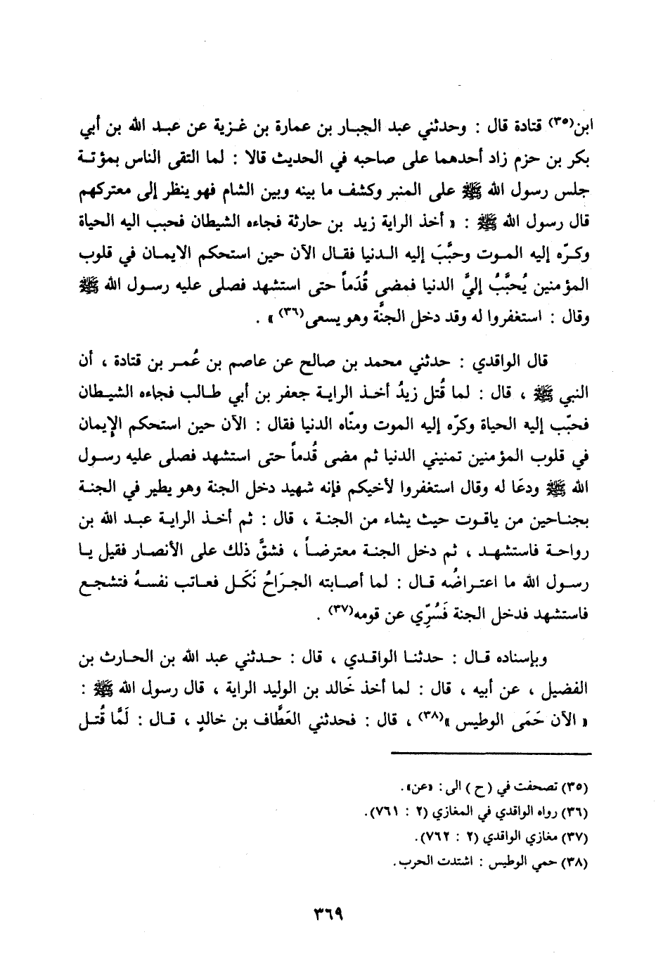 ابن [ (35) ] قَتَادَةَ قَالَ: وَحَدَّثَنِي عَبْدُ الْجَبَّارِ بْنُ عُمَارَةَ بْنِ غَزِيَّةَ عَنْ عَبْدُ اللهِ بْنُ أَبِي بَكْرِ بْنِ حَزْمٍ زَادَ أَحَدُهُمَا عَلَى صَاحِبِهِ فِي الْحَدِيثِ قَالَا: لَمَّا الْتَقَى النَّاسُ بِمُؤتَةَ جَلَسَ رَسُولُ اللهِ صَلَّى الله عليه وسلم على الْمِنْبَرِ وَكُشِفَ مَا بَيْنَهُ وَبَيْنَ الشَّامِ فَهُوَ يَنْظُرُ إِلَى مُعْتَرَكِهِمْ قَالَ رَسُولُ اللهِ صَلَّى اللهُ عَلَيْهِ وَسَلَّمَ: «أَخَذَ الرَّايَةَ زَيْدُ بْنُ حَارِثَةَ فَجَاءَهُ الشَّيْطَانُ فَحَبَّبَ إِلَيْهِ الْحَيَاةَ وَكَرَّهَ إِلَيْهِ الْمَوْتَ وَحَبَّبَ إِلَيْهِ الدُّنْيَا فَقَالَ الْآنَ حِينَ اسْتَحْكَمَ الْإِيمَانُ فِي قُلُوبِ الْمُؤْمِنِينَ يُحَبَّبُ إِلَيَّ الدُّنْيَا فَمَضَى قُدُمًا حَتَّى اسْتُشْهِدَ فَصَلَّى عَلَيْهِ رَسُولُ اللهِ صَلَّى اللهُ عَلَيْهِ وَسَلَّمَ وَقَالَ: اسْتَغْفِرُوا لَهُ وَقَدْ دَخَلَ الْجَنَّةَ وَهُوَ يَسْعَى [ (36) ] » .