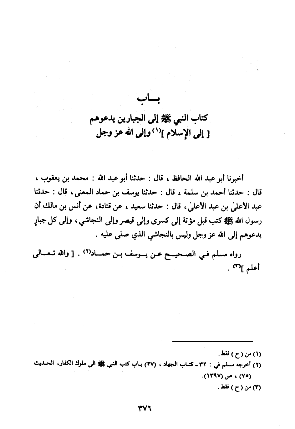 أَخْبَرَنَا أَبُو عَبْدِ اللهِ الْحَافِظُ، قَالَ: حَدَّثَنَا أَبُو عَبْدِ اللهِ: مُحَمَّدُ بْنُ يَعْقُوبَ، قَالَ: حَدَّثَنَا أَحْمَدُ بْنُ سَلَمَةَ، قَالَ: حَدَّثَنَا يُوسُفُ بْنُ حَمَّادٍ الْمَعْنِيُّ، قَالَ: حَدَّثَنَا عَبْدُ الْأَعْلَى بْنُ عَبْدِ الْأَعْلَى، قَالَ: حَدَّثَنَا سَعِيدٌ، عَنْ قَتَادَةَ، عَنْ أَنَسِ بْنِ مَالِكٍ أَنَّ رَسُولَ اللهِ صلى اللهُ عَلَيْهِ وَسَلَّمَ كَتَبَ قَبْلَ مُؤْتَةَ إِلَى كِسْرَى وَإِلَى قَيْصَرَ وَإِلَى النَّجَاشِيِّ، وَإِلَى كُلِّ جَبَّارٍ يَدْعُوهُمْ إِلَى اللهِ عَزَّ وَجَلَّ وَلَيْسَ بِالنَّجَاشِيِّ الَّذِي صَلَّى عَلَيْهِ.