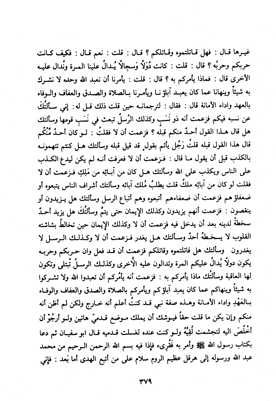 غَيْرُهَا قَالَ: فَهَلْ قَاتَلْتُمُوهُ وَقَاتَلَكُمْ؟ قَالَ: قُلْتُ: نَعَمْ قَالَ: فَكَيْفَ كَانَتْ حَرْبُكُمْ وَحَرْبُهُ؟ قَالَ: قُلْتُ: كَانَتْ دُوَلًا وَسِجَالًا يُدَالُ عَلَيْنَا الْمَرَّةَ وَنُدَالُ عَلَيْهِ الْأُخْرَى قَالَ: فَمَاذَا يَأْمُرُكُمْ بِهِ؟ قَالَ: قُلْتُ: يَأْمُرُنَا أَنْ نَعْبُدَ اللهَ وَحْدَهُ لَا نُشْرِكُ بِهِ شَيْئًا وَيَنْهَانَا عَمَّا كَانَ يَعْبُدُ آبَاؤُنَا وَيَأْمُرُنَا بِالصَّلَاةِ وَالصِّدْقِ وَالْعَفَافِ وَالْوَفَاءِ بِالْعَهْدِ وَأَدَاءِ الْأَمَانَةِ قَالَ: فَقَالَ: لِتَرْجُمَانِهِ حِينَ قُلْتُ ذَلِكَ قُلْ لَهُ: إِنِّي سَأَلْتُكَ عَنْ نَسَبِهِ فِيكُمْ فَزَعَمْتَ أَنَّهُ ذُو نَسَبٍ وَكَذَلِكَ الرُّسُلُ تُبْعَثُ فِي نَسَبِ قَوْمِهَا وَسَأَلْتُكَ هَلْ قَالَ هَذَا الْقَوْلَ أَحَدٌ مِنْكُمْ قَبْلَهُ؟ فَزَعَمْتَ أَنْ لَا فَقُلْتُ: لَوْ كَانَ أَحَدٌ مِنْكُمْ قَالَ هَذَا الْقَوْلَ قَبْلَهُ قُلْتُ رَجُلٌ يَأْتَمُّ بِقَوْلٍ قَدْ قِيلَ قَبْلَهُ وَسَأَلْتُكَ هَلْ كُنْتُمْ تَتَّهِمُونَهُ بِالْكَذِبِ قَبْلَ أَنْ يَقُولَ مَا قَالَ: فَزَعَمْتَ أَنْ لَا فَعَرَفْتُ أَنَّهُ لَمْ يَكُنْ لِيَدَعَ الْكَذِبَ عَلَى النَّاسِ وَيَكْذِبَ عَلَى اللهِ وَسَأَلْتُكَ هَلْ كَانَ مِنْ آبَائِهِ مِنْ مَلِكٍ فَزَعَمْتَ أَنْ لَا فَقُلْتُ لَوْ كَانَ مِنْ آبَائِهِ مَلِكٌ قُلْتُ يَطْلُبُ مُلْكَ آبَائِهِ وَسَأَلْتُكَ أَشْرَافُ النَّاسِ يَتَّبِعُوهُ أَوْ ضُعَفَاؤُهُمْ فَزَعَمْتَ أَنَّ ضُعَفَاءَهُمُ اتَّبَعُوهُ وَهُمْ أَتْبَاعُ الرُّسُلِ وَسَأَلْتُكَ هَلْ يَزِيدُونَ أَوْ يَنْقُصُونَ: فَزَعَمْتَ أَنَّهُمْ يَزِيدُونَ وَكَذَلِكَ الْإِيمَانُ حَتَّى يَتِمَّ وَسَأَلْتُكَ هَلْ يَزِيدُ أَحَدٌ سَخْطَةً لِدِينِهِ بَعْدَ أَنْ يَدْخُلَ فِيهِ فَزَعَمْتَ أَنْ لَا وَكَذَلِكَ الْإِيمَانُ حِينَ تُخَالِطُ بَشَاشَتُهُ الْقُلُوبَ لَا يَسْخَطُهُ أَحَدٌ وَسَأَلْتُكَ هَلْ يَغْدِرُ فَزَعَمْتَ أَنْ لَا وَكَذَلِكَ الرُّسُلُ لَا يَغْدِرُونَ وَسَأَلْتُكَ هَلْ قَاتَلْتُمُوهُ وَقَاتَلَكُمْ فَزَعَمْتَ أَنْ قَدْ فَعَلَ وَأَنَّ حَرْبَكُمْ وَحَرْبَهُ يَكُونُ دُوَلًا يُدَالُ عَلَيْكُمُ الْمَرَّةَ وَتُدَالُونَ عَلَيْهِ الْأُخْرَى وَكَذَلِكَ الرُّسُلُ تُبْتَلَى وَتَكُونُ لَهَا الْعَاقِبَةُ وَسَأَلْتُكَ مَاذَا يَأْمُرُكُمْ بِهِ: فَزَعَمْتَ أَنَّهُ يَأْمُرُكُمْ أَنْ تَعْبُدُوا اللهَ وَلَا تُشْرِكُوا بِهِ شَيْئًا وَيَنْهَاكُمْ عَمَّا كَانَ يَعْبُدُ آبَاؤُكُمْ وَيَأْمُرُكُمْ بِالصَّلَاةِ وَالصِّدْقِ وَالْعَفَافِ وَالْوَفَاءِ بِالْعَهْدِ وَأَدَاءِ الْأَمَانَةِ وَهَذِهِ صِفَةُ نَبِيٍّ قَدْ كُنْتُ أَعْلَمُ أَنَّهُ خَارِجٌ وَلَكِنْ لَمْ أَظُنَّ أَنَّهُ مِنْكُمْ وَإِنْ يَكُنْ مَا قُلْتَ حَقًّا فَيُوشِكُ أَنْ يَمْلِكَ مَوْضِعَ قَدَمَيَّ هَاتَيْنِ وَلَوْ أَرْجُو أَنْ أَخْلُصَ إِلَيْهِ لَتَجَشَّمْتُ لُقِيَّهُ وَلَوْ كُنْتُ عِنْدَهُ لَغَسَلْتُ قَدَمَيْهِ