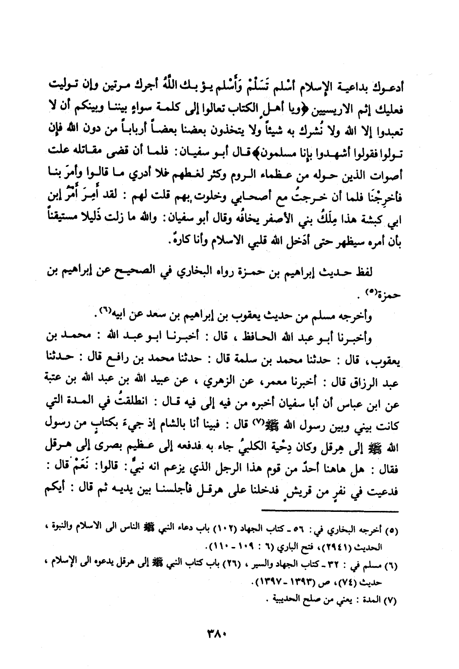[ (6) ] مسلم في: 32- كتاب الجهاد والسير، (26) بَابُ كِتَابِ النَّبِيِّ صَلَّى اللهُ عليه وسلم إلى هرقل يدعوه الى الإسلام، حديث (74) ، ص (1393- 1397) .