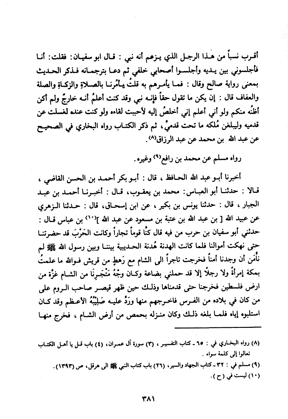 أَقْرَبُ نَسَبًا مِنْ هَذَا الرَّجُلِ الَّذِي يَزْعُمُ أَنَّهُ نَبِيٌّ: قَالَ أَبُو سُفْيَانَ: فَقُلْتُ: أَنَا فَأَجْلَسُونِي بَيْنَ يَدَيْهِ وَأَجْلَسُوا أَصْحَابِي خَلْفِي ثُمَّ دَعَا بِتَرْجُمَانِهِ فَذَكَرَ الْحَدِيثَ بِمَعْنَى رِوَايَةِ صَالِحٍ وقال: فما يأمرهم بِهِ قُلْتُ يَأْمُرُنَا بِالصَّلَاةِ وَالزَّكَاةِ وَالصِّلَةِ وَالْعَفَافِ قَالَ: إِنْ يَكُنْ مَا تَقُولُ حَقًّا فَإِنَّهُ نَبِيٌّ وَقَدْ كُنْتُ أَعْلَمُ أَنَّهُ خَارِجٌ وَلَمْ أَكُنْ أَظُنُّهُ مِنْكُمْ وَلَوْ أَنِّي أَعْلَمُ أَنِّي أَخْلُصُ إِلَيْهِ لَأَحْبَبْتُ لِقَاءَهُ وَلَوْ كُنْتُ عِنْدَهُ لَغَسَلْتُ عَنْ قَدَمَيْهِ وَلَيَبْلُغَنَّ مُلْكُهُ مَا تَحْتَ قَدَمَيَّ، ثُمَّ ذَكَرَ الْكِتَابَ رَوَاهُ الْبُخَارِيُّ فِي الصَّحِيحِ عَنْ عَبْدِ اللهِ بْنِ مُحَمَّدٍ عَنْ عَبْدِ الرَّزَّاقِ [ (8) ] .