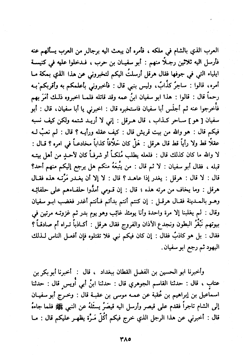 الْعَرَبِ الَّذِي بِالشَّامِ فِي مُلْكِهِ، فَأَمَرَهُ أَنْ يَبْعَثَ إِلَيْهِ بِرِجَالٍ مِنَ الْعَرَبِ يَسْأَلُهُمْ عَنْهُ فَأَرْسَلَ إِلَيْهِ ثَلَاثِينَ رَجُلًا مِنْهُمْ: أَبُو سُفْيَانَ بْنُ حَرْبٍ، فَدَخَلُوا عليه في كنيسة إيليا الَّتِي فِي جَوْفِهَا فَقَالَ هِرَقْلُ أَرْسَلْتُ إِلَيْكُمْ لِتُخْبِرُونِي عَنْ هَذَا الَّذِي بِمَكَّةَ مَا أَمْرُهُ، قَالُوا: سَاحِرٌ كَذَّابٌ، وَلَيْسَ بِنَبِيٍّ قَالَ: فَأَخْبِرُونِي بِأَعْلَمِكُمْ بِهِ وَأَقْرَبِكُمْ بِهِ رَحِمًا قَالَ: قَالُوا: هَذَا أَبُو سُفْيَانَ ابْنُ عَمِّهِ وَقَدْ قَاتَلَهُ فَلَمَّا أَخْبَرُوهُ ذَلِكَ أَمَرَ بِهِمْ فَأُخْرِجُوا عَنْهُ ثُمَّ أَجْلَسَ أَبَا سُفْيَانَ فَاسْتَخْبَرَهُ قَالَ: أَخْبِرْنِي يَا أَبَا سُفْيَانَ، قَالَ: أَبُو سُفْيَانَ [هُوَ] سَاحِرٌ كَذَّابٌ، قَالَ هِرَقْلُ: إِنِّي لَا أُرِيدُ شَتْمَهُ وَلَكِنْ كَيْفَ نَسَبُهُ فِيكُمْ قَالَ: هُوَ وَاللهِ مِنْ بَيْتِ قُرَيْشٍ قَالَ: كَيْفَ عَقْلُهُ وَرَأْيُهُ؟ قَالَ: لَمْ نُعِبْ لَهُ عَقْلًا قَطُّ وَلَا رَأْيًا قَطُّ قَالَ هِرَقْلُ: هَلْ كَانَ حَلَّافًا كَذَّابًا مُخَادِعًا فِي أَمْرِهِ؟ قَالَ: