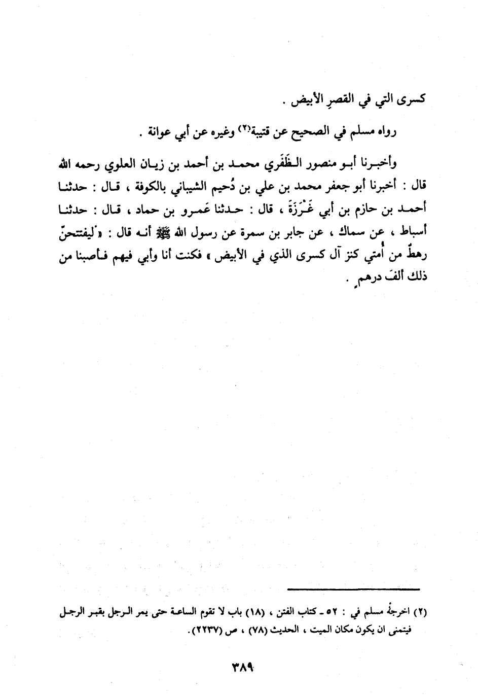 وَأَخْبَرَنَا أَبُو مَنْصُورٍ الظَّفَرِيُّ مُحَمَّدُ بْنُ أَحْمَدَ بْنُ زيان الْعَلَوِيُّ رَحِمَهُ اللهُ قَالَ: أَخْبَرَنَا أَبُو جَعْفَرٍ مُحَمَّدُ بْنُ عَلِيِّ بْنِ دُحَيْمٍ الشَّيْبَانِيُّ بِالْكُوفَةِ، قَالَ: حَدَّثَنَا أَحْمَدُ بْنُ حَازِمِ بْنِ أَبِي غَرَزَةَ، قَالَ: حَدَّثَنَا عَمْرُو بْنُ حَمَّادٍ، قَالَ: حَدَّثَنَا أَسْبَاطٌ، عَنْ سِمَاكٍ، عَنْ جَابِرِ بْنِ سَمُرَةَ عَنْ رَسُولِ اللهِ صَلَّى اللهُ عَلَيْهِ وسلم أَنَّهُ قَالَ: «لَيَفْتَتِحَنَّ رَهْطٌ مِنْ أُمَّتِي كَنْزَ آلِ كِسْرَى الَّذِي فِي الْأَبْيَضِ» فَكُنْتُ أَنَا وَأَبِي فِيهِمْ فَأَصَبْنَا مِنْ ذَلِكَ أَلْفَ دِرْهَمٍ.