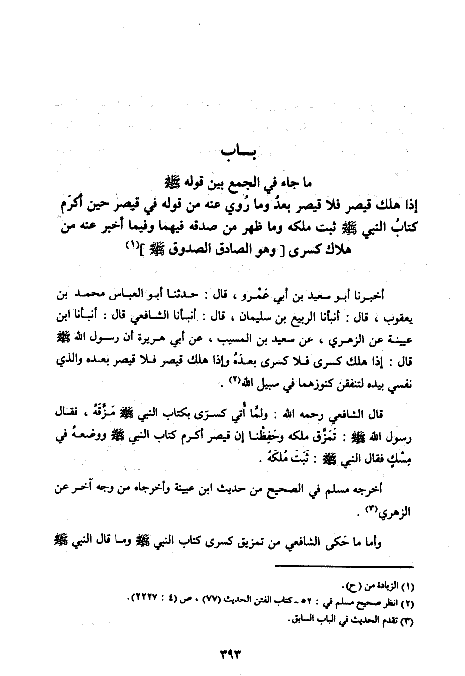 قَالَ الشَّافِعِيُّ رَحِمَهُ اللهُ: وَلَمَّا أُتِيَ كِسْرَى بِكِتَابِ النَّبِيِّ صَلَّى اللهُ عَلَيْهِ وَسَلَّمَ مَزَّقَهُ، فَقَالَ رَسُولُ اللهِ صَلَّى اللهُ عَلَيْهِ وَسَلَّمَ: تَمَزَّقَ مُلْكُهُ وَحَفِظْنَا أَنَّ قَيْصَرَ أَكْرَمَ كِتَابَ النَّبِيِّ صَلَّى اللهُ عَلَيْهِ وَسَلَّمَ وَوَضَعَهُ فِي مِسْكٍ فَقَالَ النَّبِيُّ صَلَّى اللهُ عَلَيْهِ وسلم: ثَبَتَ مُلْكُهُ.