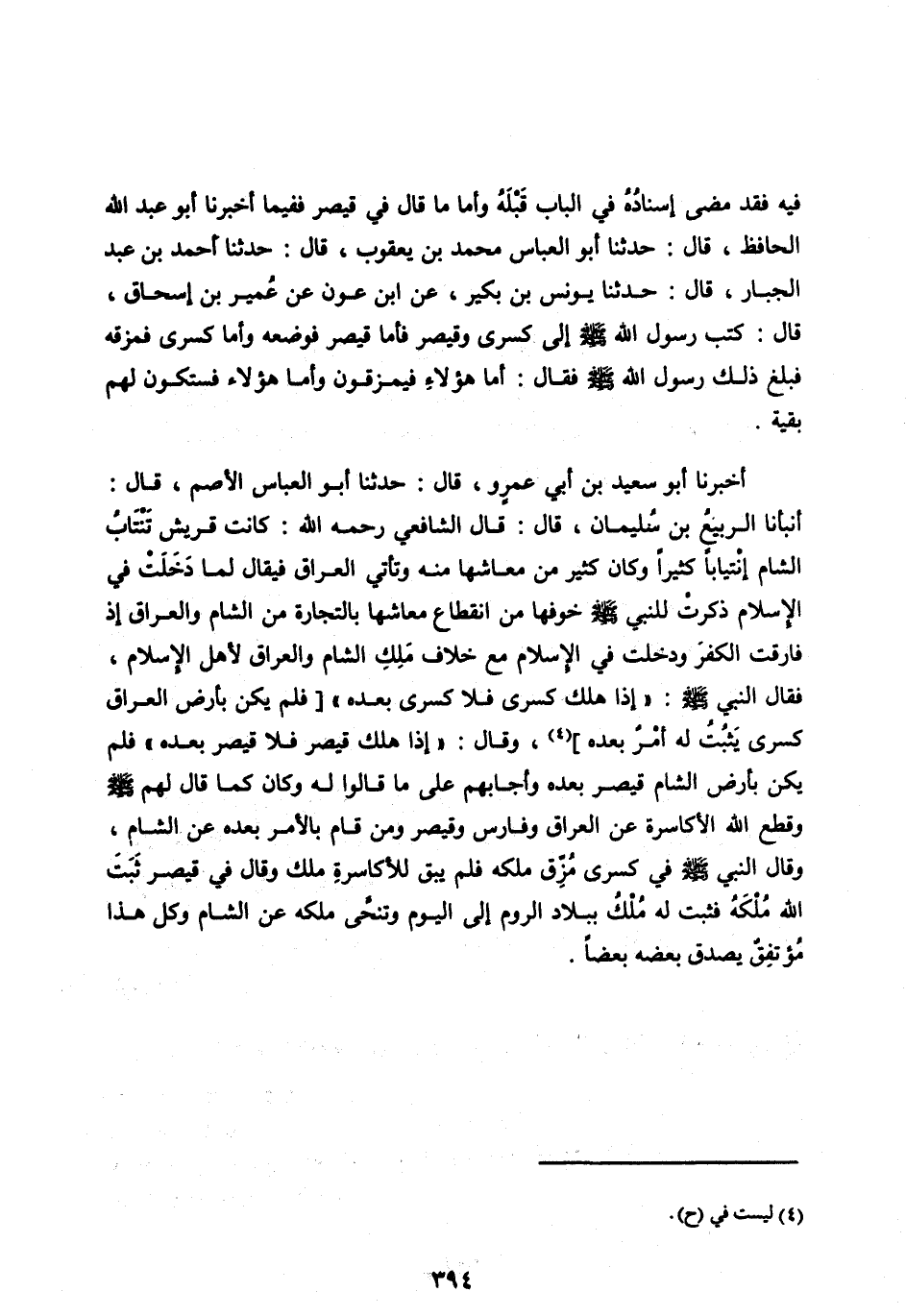 أَنْبَأَنَا الرَّبِيعُ بْنُ سُلَيْمَانَ، قَالَ: قَالَ الشَّافِعِيُّ رَحِمَهُ اللهُ: كَانَتْ قُرَيْشٌ تَنْتَابُ الشَّامَ انْتِيَابًا كَثِيرًا وَكَانَ كَثِيرٌ مِنْ مَعَاشِهَا مِنْهُ وَتَأْتِي الْعِرَاقَ فَيُقَالُ لَمَّا دَخَلَتْ فِي الْإِسْلَامِ ذَكَرَتْ لِلنَّبِيِّ صَلَّى اللهُ عَلَيْهِ وَسَلَّمَ خَوْفَهَا مِنِ انْقِطَاعِ مَعَاشِهَا بِالتِّجَارَةِ مِنَ الشَّامِ وَالْعِرَاقِ إِذْ فَارَقَتِ الْكُفْرَ وَدَخَلَتْ فِي الْإِسْلَامِ مَعَ خِلَافِ مَلِكِ الشَّامِ وَالْعِرَاقِ لِأَهْلِ الْإِسْلَامِ، فَقَالَ النَّبِيُّ صَلَّى اللهُ عَلَيْهِ وَسَلَّمَ: «إِذَا هَلَكَ كِسْرَى فَلَا كِسْرَى بَعْدَهُ» [فَلَمْ يَكُنْ بِأَرْضِ الْعِرَاقِ كِسْرَى يَثْبُتْ لَهُ أَمْرٌ بَعْدَهُ] [ (4) ] ، وَقَالَ: «إِذَا هَلَكَ قَيْصَرُ فَلَا قَيْصَرَ بَعْدَهُ» فَلَمْ يَكُنْ بِأَرْضِ الشَّامِ قَيْصَرُ بَعْدَهُ وَأَجَابَهُمْ عَلَى مَا قَالُوا لَهُ وَكَانَ كَمَا قَالَ لَهُمْ صَلَّى اللهُ عَلَيْهِ وَسَلَّمَ وَقَطَعَ اللهُ الْأَكَاسِرَةَ عَنِ الْعِرَاقِ وَفَارِسَ وَقَيْصَرَ وَمَنْ قَامَ بِالْأَمْرِ بَعْدَهُ عَنِ الشَّامِ، وَقَالَ النَّبِيُّ صَلَّى اللهُ عليه وَسَلَّمَ فِي كِسْرَى مُزِّقَ مُلْكُهُ فَلَمْ يَبْقَ لِلْأَكَاسِرَةِ مُلْكٌ وَقَالَ فِي قَيْصَرَ ثَبَّتَ اللهُ مُلْكَهُ فَثَبَتَ لَهُ ملك ببلاد الرُّومِ إِلَى الْيَوْمِ وَتَنَحَّى مُلْكُهُ عَنِ الشَّامِ وَكُلُّ هَذَا مُؤتَفِقٌ يُصَدِّقُ بَعْضُهُ بعضا.