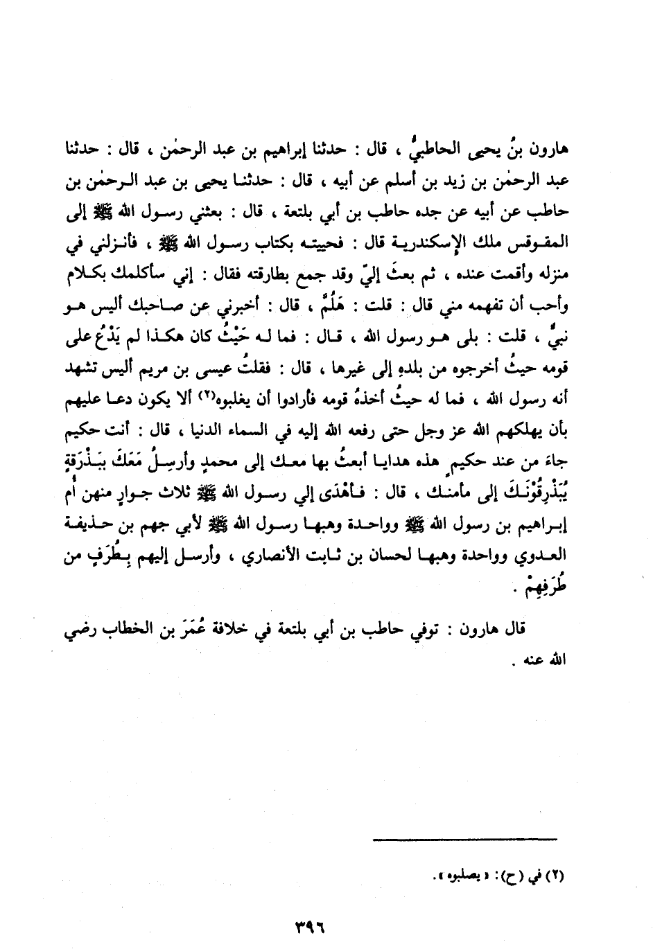 هَارُونُ بْنُ يَحْيَى الْحَاطِبِيُّ، قَالَ: حَدَّثَنَا إِبْرَاهِيمُ بْنُ عَبْدِ الرَّحْمَنِ، قَالَ: حَدَّثَنَا عَبْدُ الرَّحْمَنِ بْنُ زَيْدِ بْنِ أَسْلَمَ عَنْ أَبِيهِ، قَالَ: حَدَّثَنَا يَحْيَى بْنُ عَبْدِ الرَّحْمَنِ بْنِ حَاطِبٍ عَنْ أَبِيهِ عَنْ جَدِّهِ حَاطِبِ بْنِ أَبِي بَلْتَعَةَ، قَالَ: بَعَثَنِي رَسُولُ اللهِ صَلَّى اللهُ عَلَيْهِ وسلم إِلَى الْمُقَوْقِسَ مَلِكِ الْإِسْكَنْدَرِيَّةِ قَالَ: فَحَيَّيْتُهُ بِكِتَابِ رَسُولِ الله صلى الله عليه وَسَلَّمَ، فَأَنْزَلَنِي فِي مَنْزِلِهِ وَأَقَمْتُ عِنْدَهُ، ثُمَّ بَعَثَ إِلَيَّ وَقَدْ جَمَعَ بَطَارِقَتَهُ فَقَالَ: إِنِّي سَأُكَلِّمُكَ بِكَلَامٍ وَأُحِبُّ أَنْ تَفْهَمَهُ مِنِّي قَالَ: قُلْتُ: هَلُمَّ، قَالَ: أَخْبِرْنِي عَنْ صَاحِبِكَ أَلَيْسَ هُوَ نَبِيٌّ، قُلْتُ: بَلَى هُوَ رَسُولُ اللهِ، قَالَ: فَمَا لَهُ حَيْثُ كَانَ هَكَذَا لَمْ يَدْعُ عَلَى قَوْمِهِ حَيْثُ أَخْرَجُوهُ مِنْ بَلَدِهِ إِلَى غَيْرِهَا، قَالَ: فقلت عيسى بن مَرْيَمَ أَلَيْسَ تَشْهَدُ أَنَّهُ رَسُولُ اللهِ، فَمَا لَهُ حَيْثُ أَخَذَهُ قَوْمُهُ فَأَرَادُوا أَنْ يَغْلِبُوهُ [ (2) ] أَلَّا يَكُونَ دَعَا عَلَيْهِمْ بِأَنْ يُهْلِكَهُمُ اللهُ عَزَّ وَجَلَّ حَتَّى رَفَعَهُ اللهُ إِلَيْهِ فِي السَّمَاءِ الدُّنْيَا، قَالَ: أَنْتَ حَكِيمٌ جَاءَ مِنْ عِنْدِ حَكِيمٍ هَذِهِ هَدَايَا أَبْعَثُ بِهَا مَعَكَ إِلَى مُحَمَّدٍ وَأُرْسِلُ مَعَكَ بِبَذْرَقَةٍ يُبَذْرِقُونَكَ إِلَى مَأْمَنِكَ، قَالَ: فَأَهْدَى إِلَى رَسُولِ اللهِ صَلَّى اللهُ عَلَيْهِ وَسَلَّمَ ثَلَاثٌ جَوَارٍ مِنْهُنَّ أُمُّ إِبْرَاهِيمُ بْنُ رَسُولِ اللهِ صَلَّى اللهُ عَلَيْهِ وَسَلَّمَ وَوَاحِدَةٌ وَهَبَهَا رَسُولُ اللهِ صَلَّى اللهُ عَلَيْهِ وَسَلَّمَ لِأَبِي جَهْمِ بْنِ حُذَيْفَةَ الْعَدَوِيِّ وَوَاحِدَةٌ وَهَبَهَا لِحَسَّانَ بْنِ ثَابِتٍ الْأَنْصَارِيِّ، وَأَرْسَلَ إِلَيْهِمْ بِطُرَفٍ مِنْ طُرَفِهِمْ.