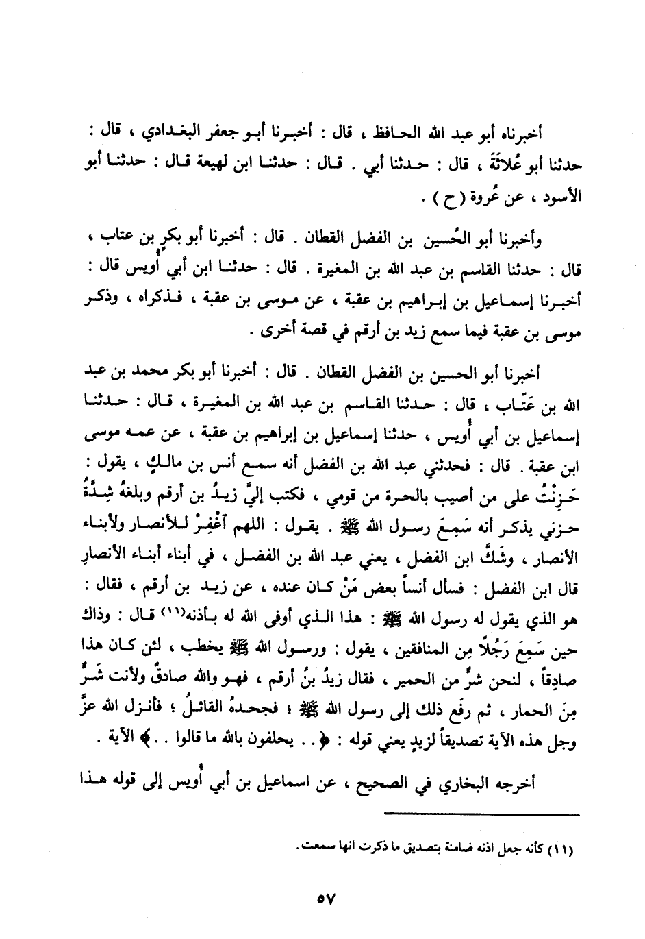 وأَخْبَرَنَا أَبُو الْحُسَيْنِ بْنُ الْفَضْلِ الْقَطَّانُ، قَالَ: أَخْبَرَنَا أَبُو بَكْرِ بْنُ عَتَّابٍ قَالَ: حَدَّثَنَا الْقَاسِمُ الْجَوْهَرِيُّ، قَالَ: حَدَّثَنَا ابْنُ أَبِي أُوَيْسٍ، قَالَ: حَدَّثَنَا إِسْمَاعِيلُ بْنُ إِبْرَاهِيمَ بْنِ عُقْبَةَ، عَنْ مُوسَى بْنِ عُقْبَةَ، فِي قِصَّةِ غَزْوَةِ بَنِي الْمُصْطَلِقِ، قَالَا: فَلَمَّا نَزَلَ رَسُولُ اللهِ صَلَّى الله عليه وَسَلَّمَ صَنْعَاءَ مِنْ طَرِيقِ عُمَانَ، سَرَّحَ النَّاسُ ظَهْرَهُمْ، وَأَخَذَتْهُمْ رِيحٌ شَدِيدَةٌ، حَتَّى أَشْفَقَ النَّاسُ مِنْهَا، وَقِيلَ: يَا رَسُولَ اللهِ! مَا شَأْنُ هَذِهِ الرِّيحِ؟ فَزَعَمُوا أَنَّهُ قَالَ: مَاتَ الْيَوْمَ مُنَافِقٌ عَظِيمُ النِّفَاقِ، وَلِذَلِكَ عَصَفَتِ الرِّيحُ، وَلَيْسَ عَلَيْكُمْ مِنْهَا بَأْسٌ، إِنْ شَاءَ اللهُ- وَكَانَ مَوْتُهُ غَائِظًا لِلْمُنَافِقِينَ.