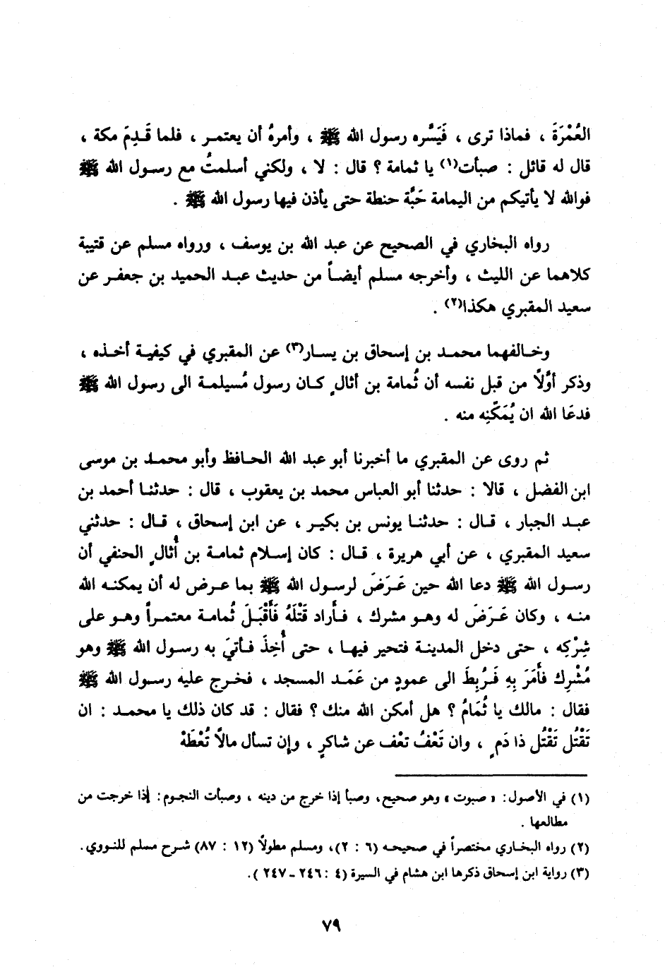 وَهَذِهِ الرِّوَايَةُ تُوهِمُ أَنْ يَكُونَ صَدْرُ الْحَدِيثِ فِي رِوَايَةِ يُونُسَ بْنِ بُكَيْرٍ مِنْ قَوْلِ مُحَمَّدُ بْنُ إِسْحَاقَ عَنْ شُيُوخِهِ، وَرِوَايَةُ اللَّيْثِ بْنِ سَعْدٍ وَمَنْ تَابَعَهُ أَصَحُّ فِي كَيْفِيَّةِ أَخْذِهِ وَالَّذِي رُوِيَ فِي حَدِيثِ مُحَمَّدِ بْنِ إِسْحَاقَ مِنْ قَوْلِ أَبِي هُرَيْرَةَ وَغَيْرِهِ فِي إِرَادَةِ فِدَائِهِ يَدُلُّ عَلَى شُهُودِ أَبِي هُرَيْرَةَ ذَلِكَ، وَأَبُو هُرَيْرَةَ إِنَّمَا قَدِمَ عَلَى النَّبِيِّ صَلَّى اللهُ عَلَيْهِ وَسَلَّمَ وَهُوَ بِخَيْبَرَ فَيُشْبِهُ أَنْ يَكُونَ قِصَّةُ ثُمَامَةَ فِيمَا بَيْنَ خَيْبَرَ وَفَتَحِ مَكَّةَ وَاللهُ أَعْلَمُ.