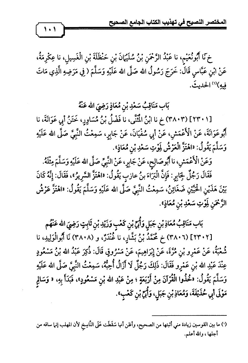 [2301] (3803) خ نا ابْنُ الْمُثَنَّى, نا فَضْلُ بْنُ مُسَاوِرٍ, خَتَنُ أبِي عَوَانَةَ, نا أَبُوعَوَانَةَ, عَنْ الْأَعْمَشِ, عَنْ أبِي سُفْيَانَ, عَنْ جَابِرٍ, سَمِعْتُ النَّبِيَّ صَلَّى الله عَلَيْهِ وَسَلَّمَ يَقُولُ: «اهْتَزَّ الْعَرْشُ لِمَوْتِ سَعْدِ بْنِ مُعَاذٍ».