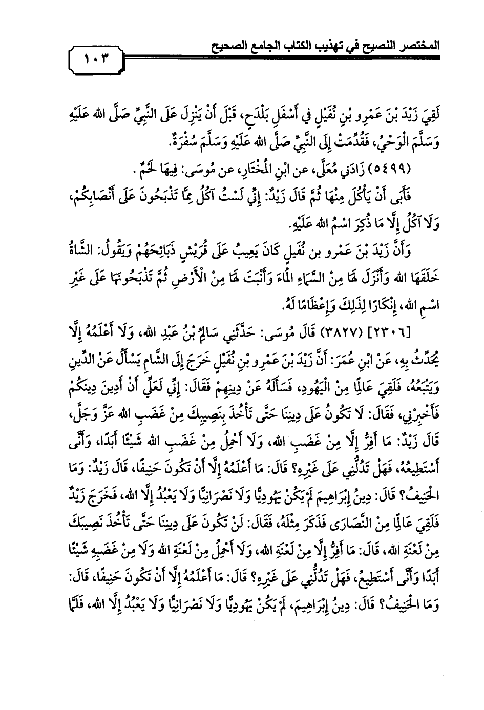 [2306] (3827) قَالَ مُوسَى: حَدَّثَنِي سَالِمُ بْنُ عَبْدِ الله، وَلَا أَعْلَمُهُ إِلَّا يُحَدِّثُ بِهِ, عَنْ ابْنِ عُمَرَ: أَنَّ زَيْدَ بْنَ عَمْرِو بْنِ نُفَيْلٍ خَرَجَ إِلَى الشَّامِ يَسْأَلُ عَنْ الدِّينِ وَيَتْبَعُهُ، فَلَقِيَ عَالِمًا مِنْ الْيَهُودِ، فَسَأَلَهُ عَنْ دِينِهِمْ فَقَالَ: إِنِّي لَعَلِّي أَنْ أَدِينَ دِينَكُمْ فَأَخْبِرْنِي، فَقَالَ: لَا تَكُونُ عَلَى دِينِنَا حَتَّى تَأْخُذَ بِنَصِيبِكَ مِنْ غَضَبِ الله عَزَّ وَجَلَّ, قَالَ زَيْدٌ: مَا أَفِرُّ إِلَّا مِنْ غَضَبِ الله، وَلَا أَحْمِلُ مِنْ غَضَبِ الله شَيْئًا أَبَدًا، وَأَنَّى أَسْتَطِيعُهُ، فَهَلْ تَدُلُّنِي عَلَى غَيْرِهِ؟ قَالَ: مَا أَعْلَمُهُ إِلَّا أَنْ تَكُونَ حَنِيفًا، قَالَ زَيْدٌ: وَمَا الْحَنِيفُ؟ قَالَ: دِينُ إِبْرَاهِيمَ لَمْ يَكُنْ يَهُودِيًّا وَلَا نَصْرَانِيًّا وَلَا يَعْبُدُ إِلَّا الله، فَخَرَجَ زَيْدٌ فَلَقِيَ عَالِمًا مِنْ النَّصَارَى فَذَكَرَ مِثْلَهُ، فَقَالَ: لَنْ تَكُونَ عَلَى دِينِنَا حَتَّى تَأْخُذَ نَصِيبَكَ مِنْ لَعْنَةِ الله، قَالَ: مَا أَفِرُّ إِلَّا مِنْ لَعْنَةِ الله، وَلَا أَحْمِلُ مِنْ لَعْنَةِ الله وَلَا مِنْ غَضَبِهِ شَيْئًا أَبَدًا وَأَنَّى أَسْتَطِيعُ، فَهَلْ تَدُلُّنِي عَلَى غَيْرِهِ؟ قَالَ: مَا أَعْلَمُهُ إِلَّا أَنْ تَكُونَ حَنِيفًا، قَالَ: وَمَا الْحَنِيفُ؟ قَالَ: دِينُ إِبْرَاهِيمَ، لَمْ يَكُنْ يَهُودِيًّا وَلَا نَصْرَانِيًّا وَلَا يَعْبُدُ إِلَّا الله، فَلَمَّا