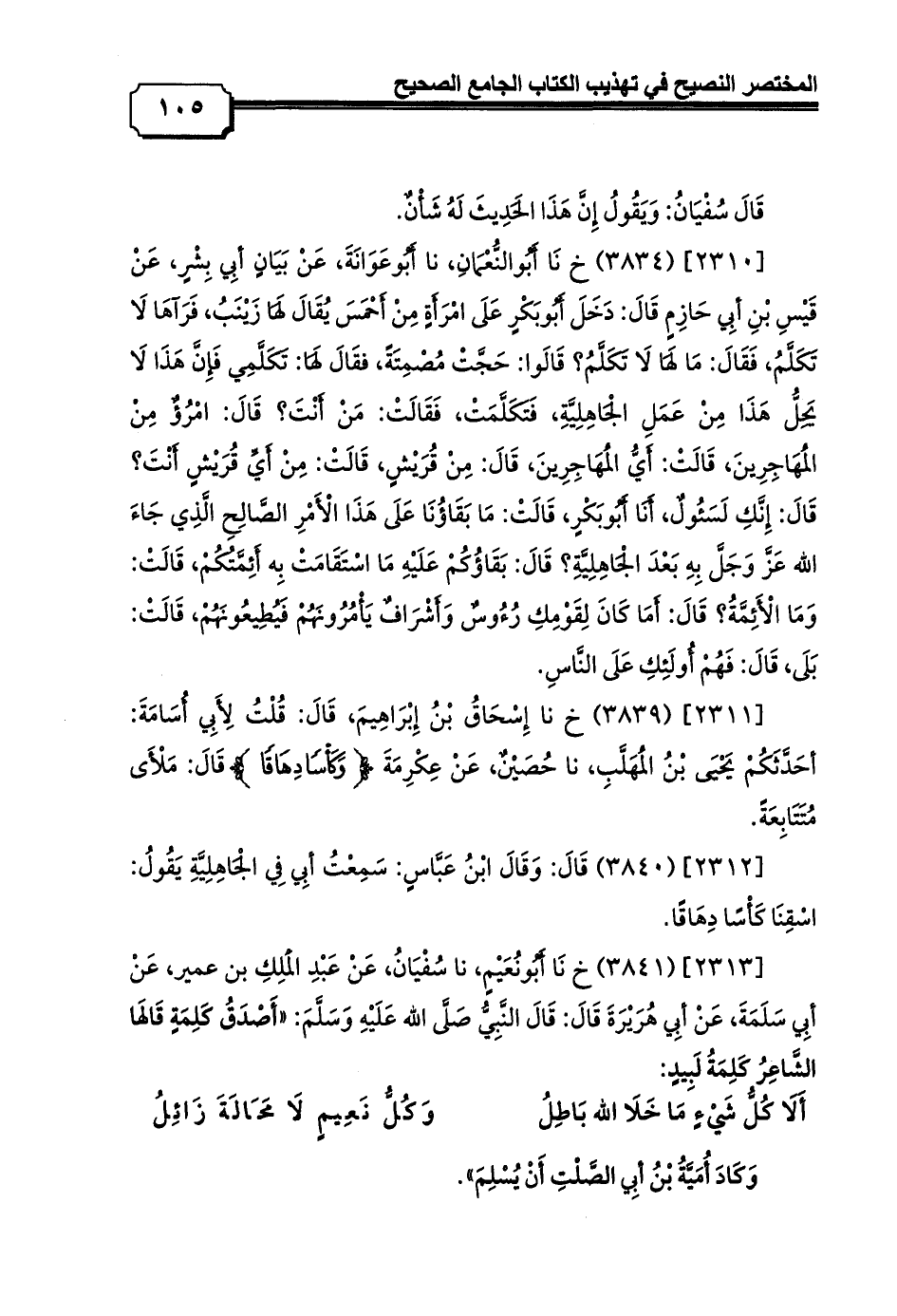 [2310] (3834) خ نَا أَبُوالنُّعْمَانِ, نا أَبُوعَوَانَةَ, عَنْ بَيَانٍ أبِي بِشْرٍ, عَنْ قَيْسِ بْنِ أبِي حَازِمٍ قَالَ: دَخَلَ أَبُوبَكْرٍ عَلَى امْرَأَةٍ مِنْ أَحْمَسَ يُقَالَ لَهَا زَيْنَبُ، فَرَآهَا لَا تَكَلَّمُ، فَقَالَ: مَا لَهَا لَا تَكَلَّمُ؟ قَالَوا: حَجَّتْ مُصْمِتَةً، فقَالَ لَهَا: تَكَلَّمِي فَإِنَّ هَذَا لَا يَحِلُّ هَذَا مِنْ عَمَلِ الْجَاهِلِيَّةِ، فَتَكَلَّمَتْ، فَقَالَتْ: مَنْ أَنْتَ؟ قَالَ: امْرُؤٌ مِنْ الْمُهَاجِرِينَ، قَالَتْ: أَيُّ الْمُهَاجِرِينَ، قَالَ: مِنْ قُرَيْشٍ، قَالَتْ: مِنْ أَيِّ قُرَيْشٍ أَنْتَ؟ قَالَ: إِنَّكِ لَسَئُولٌ، أَنَا أَبُوبَكْرٍ، قَالَتْ: مَا بَقَاؤُنَا عَلَى هَذَا الْأَمْرِ الصَّالِحِ الَّذِي جَاءَ الله عَزَّ وَجَلَّ بِهِ بَعْدَ الْجَاهِلِيَّةِ؟ قَالَ: بَقَاؤُكُمْ عَلَيْهِ مَا اسْتَقَامَتْ بِه أَئِمَّتُكُمْ، قَالَتْ: وَمَا الْأَئِمَّةُ؟ قَالَ: أَمَا كَانَ لِقَوْمِكِ رُءُوسٌ وَأَشْرَافٌ يَأْمُرُونَهُمْ فَيُطِيعُونَهُمْ، قَالَتْ: بَلَى، قَالَ: فَهُمْ أُولَئِكِ عَلَى النَّاسِ.