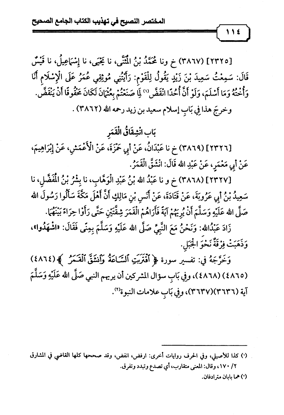 وَخَرَّجَهُ في: تفسير سورة {اقْتَرَبَتِ السَّاعَةُ وَانْشَقَّ الْقَمَرُ} (4864) (4865) (4868)، وفِي بَابِ سؤال المشركين أن يريهم النبي صَلَّى الله عَلَيْهِ وَسَلَّمَ آية (3636) (3637)، وفِي بَابِ علامات النبوة (¬2).
