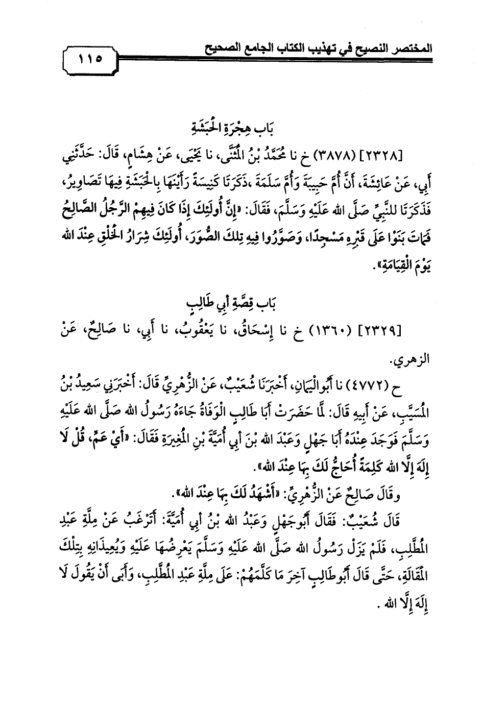 ح (4772) نا أَبُوالْيَمَانِ, أَخْبَرَنَا شُعَيْبٌ, عَنْ الزُّهْرِيِّ قَالَ: أَخْبَرَنِي سَعِيدُ بْنُ الْمُسَيَّبِ, عَنْ أَبِيهِ قَالَ: لَمَّا حَضَرَتْ أَبَا طَالِبٍ الْوَفَاةُ جَاءَهُ رَسُولُ الله صَلَّى الله عَلَيْهِ وَسَلَّمَ فَوَجَدَ عِنْدَهُ أَبَا جَهْلٍ وَعَبْدَ الله بْنَ أبِي أُمَيَّةَ بْنِ الْمُغِيرَةِ فَقَالَ: «أَيْ عَمِّ، قُلْ لَا إِلَهَ إِلَّا الله كَلِمَةً أُحَاجُّ لَكَ بِهَا عِنْدَ الله».