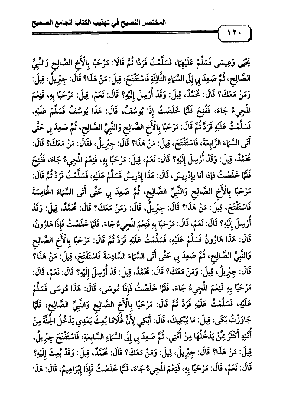 يَحْيَى وَعِيسَى فَسَلِّمْ عَلَيْهِمَا، فَسَلَّمْتُ فَرَدَّا ثُمَّ قَالَا: مَرْحَبًا بِالْأَخِ الصَّالِحِ وَالنَّبِيِّ الصَّالِحِ، ثُمَّ صَعِدَ بِي إِلَى السَّمَاءِ الثَّالِثَةِ فَاسْتَفْتَحَ، قِيلَ: مَنْ هَذَا؟ قَالَ: جِبْرِيلُ، قِيلَ: وَمَنْ مَعَكَ؟ قَالَ: مُحَمَّدٌ، قِيلَ: وَقَدْ أُرْسِلَ إِلَيْهِ؟ قَالَ: نَعَمْ، قِيلَ: مَرْحَبًا بِهِ، فَنِعْمَ الْمَجِيءُ جَاءَ، فَفُتِحَ فَلَمَّا خَلَصْتُ إِذَا يُوسُفُ، قَالَ: هَذَا يُوسُفُ فَسَلِّمْ عَلَيْهِ، فَسَلَّمْتُ عَلَيْهِ فَرَدَّ ثُمَّ قَالَ: مَرْحَبًا بِالْأَخِ الصَّالِحِ وَالنَّبِيِّ الصَّالِحِ، ثُمَّ صَعِدَ بِي حَتَّى أَتَى السَّمَاءَ الرَّابِعَةَ، فَاسْتَفْتَحَ، قِيلَ: مَنْ هَذَا؟ قَالَ: جِبْرِيلُ، فقَالَ: مَنْ مَعَكَ؟ قَالَ: مُحَمَّدٌ، قِيلَ: وَقَدْ أُرْسِلَ إِلَيْهِ؟ قَالَ: نَعَمْ، قِيلَ: مَرْحَبًا بِهِ، فَنِعْمَ الْمَجِيءُ جَاءَ، فَفُتِحَ فَلَمَّا خَلَصْتُ فإذا أنا بإِدْرِيسَ، قَالَ: هَذَا إِدْرِيسُ فَسَلِّمْ عَلَيْهِ، فَسَلَّمْتُ فَرَدَّ ثُمَّ قَالَ: مَرْحَبًا بِالْأَخِ الصَّالِحِ وَالنَّبِيِّ الصَّالِحِ, ثُمَّ صَعِدَ بِي حَتَّى أَتَى السَّمَاءَ الْخَامِسَةَ فَاسْتَفْتَحَ، قِيلَ: مَنْ هَذَا؟ قَالَ: جِبْرِيلُ، قَالَ: وَمَنْ مَعَكَ؟ قَالَ: مُحَمَّدٌ، قِيلَ: وَقَدْ أُرْسِلَ إِلَيْهِ؟ قَالَ: نَعَمْ، قَالَ: مَرْحَبًا بِهِ فَنِعْمَ الْمَجِيءُ جَاءَ، فَلَمَّا خَلَصْتُ فَإِذَا هَارُونُ، قَالَ: هَذَا هَارُونُ فَسَلِّمْ عَلَيْهِ، فَسَلَّمْتُ عَلَيْهِ فَرَدَّ ثُمَّ قَالَ: مَرْحَبًا بِالْأَخِ الصَّالِحِ وَالنَّبِيِّ الصَّالِحِ، ثُمَّ صَعِدَ بِي حَتَّى أَتَى السَّمَاءَ السَّادِسَةَ فَاسْتَفْتَحَ، قِيلَ: مَنْ هَذَا؟ قَالَ: جِبْرِيلُ، قِيلَ: وَمَنْ مَعَكَ؟ قَالَ: مُحَمَّدٌ، قِيلَ: قَدْ أُرْسِلَ إِلَيْهِ؟ قَالَ: نَعَمْ، قَالَ: مَرْحَبًا بِهِ فَنِعْمَ الْمَجِيءُ جَاءَ، فَلَمَّا خَلَصْتُ فَإِذَا مُوسَى، قَالَ: هَذَا مُوسَى فَسَلِّمْ عَلَيْهِ، فَسَلَّمْتُ عَلَيْهِ فَرَدَّ ثُمَّ قَالَ: مَرْحَبًا بِالْأَخِ الصَّالِحِ وَالنَّبِيِّ الصَّالِحِ، فَلَمَّا جَاوَزْتُ بَكَى، قِيلَ: مَا يُبْكِيكَ، قَالَ: أَبْكِي لِأَنَّ غُلَامًا بُعِثَ بَعْدِي يَدْخُلُ الْجَنَّةَ مِنْ أُمَّتِهِ أَكْثَرُ مِمَّنْ يَدْخُلُهَا مِنْ أُمَّتِي، ثُمَّ صَعِدَ بِي إِلَى السَّمَاءِ السَّابِعَةِ، فَاسْتَفْتَحَ جِبْرِيلُ، قِيلَ: مَنْ هَذَا؟ قَالَ: جِبْرِيلُ، قِيلَ: وَمَنْ مَعَكَ؟ قَالَ: مُحَمَّدٌ، قِيلَ: وَقَدْ بُعِثَ إِلَيْهِ؟ قَالَ: نَعَمْ، قَالَ: مَرْحَبًا بِهِ، فَنِعْمَ الْمَجِيءُ جَاءَ، فَلَمَّا خَلَصْتُ فَإِذَا إِبْرَاهِيمُ، قَالَ: هَذَا