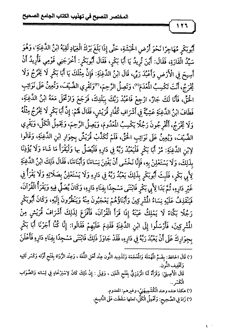 وَهُوَ سَيِّدُ الْقَارَةِ، فَقَالَ: أَيْنَ تُرِيدُ يَا أَبَا بَكْرٍ، فَقَالَ أَبُوبَكْرٍ: أَخْرَجَنِي قَوْمِي فَأُرِيدُ أَنْ أَسِيحَ فِي الْأَرْضِ وَأَعْبُدَ رَبِّي، قَالَ ابْنُ الدَّغِنَةِ: فَإِنَّ مِثْلَكَ يَا أَبَا بَكْرٍ لَا يَخْرُجُ وَلَا يُخْرَجُ، أَنْتَ تَكْسِبُ الْمُعْدَمَ (¬2) , وَتَصِلُ الرَّحِمَ, (¬3) وَتَقْرِي الضَّيْفَ, وَتُعِينُ عَلَى نَوَائِبِ الْحَقِّ، فَأَنَا لَكَ جَارٌ، ارْجِعْ فَاعْبُدْ رَبَّكَ بِبَلَدِكَ، فَرَجَعَ وَارْتَحَلَ مَعَهُ ابْنُ الدَّغِنَةِ، فَطَافَ ابْنُ الدَّغِنَةِ عَشِيَّةً فِي أَشْرَافِ كُفَّارِ قُرَيْشٍ، فَقَالَ لَهُمْ: إِنَّ أَبَا بَكْرٍ لَا يَخْرُجُ مِثْلُهُ وَلَا يُخْرَجُ، أَتُخْرِجُونَ رَجُلًا يَكْسِبُ الْمَعْدُومَ، وَيَصِلُ الرَّحِمَ، وَيَحْمِلُ الْكَلَّ، وَيَقْرِي الضَّيْفَ، وَيُعِينُ عَلَى نَوَائِبِ الْحَقِّ، فَلَمْ تُكَذِّبْ قُرَيْشٌ بِجِوَارِ ابْنِ الدَّغِنَةِ، وَقَالَوا لِابْنِ الدَّغِنَةِ: مُرْ أَبَا بَكْرٍ فَلْيَعْبُدْ رَبَّهُ فِي دَارِهِ فَلْيُصَلِّ بها وَلْيَقْرَأْ مَا شَاءَ وَلَا يُؤْذِنَا بِذَلِكَ، وَلَا يَسْتَعْلِنْ بِهِ، فَإِنَّا نَخْشَى أَنْ يَفْتِنَ نِسَاءَنَا وَأَبْنَاءَنَا، فَقَالَ ذَلِكَ ابْنُ الدَّغِنَةِ لِأَبِي بَكْرٍ، فَلَبِثَ أَبُوبَكْرٍ بِذَلِكَ يَعْبُدُ رَبَّهُ فِي دَارِهِ وَلَا يَسْتَعْلِنُ بِصَلَاتِهِ وَلَا يَقْرَأُ فِي غَيْرِ دَارِهِ، ثُمَّ بَدَا لِأَبِي بَكْرٍ فَابْتَنَى مَسْجِدًا بِفِنَاءِ دَارِهِ، وَكَانَ يُصَلِّي فِيهِ وَيَقْرَأُ الْقُرْآنَ، فَيَنْقَذِفُ عَلَيْهِ نِسَاءُ الْمُشْرِكِينَ وَأَبْنَاؤُهُمْ يَعْجَبُونَ مِنْهُ وَيَنْظُرُونَ إِلَيْهِ، وَكَانَ أَبُوبَكْرٍ رَجُلًا بَكَّاءً لَا يَمْلِكُ عَيْنَهُ إِذَا قَرَأَ الْقُرْآنَ، فَأَفْزَعَ لِذَلِكَ أَشْرَافَ قُرَيْشٍ مِنْ الْمُشْرِكِينَ، فَأَرْسَلُوا إِلَى ابْنِ الدَّغِنَةِ فَقَدِمَ عَلَيْهِمْ فَقَالَوا: إِنَّا كُنَّا أَجَرْنَا أَبَا بَكْرٍ بِجِوَارِكَ عَلَى أَنْ يَعْبُدَ رَبَّهُ فِي دَارِهِ، فَقَدْ جَاوَزَ ذَلِكَ فَابْتَنَى مَسْجِدًا بِفِنَاءِ دَارِهِ فَأَعْلَنَ