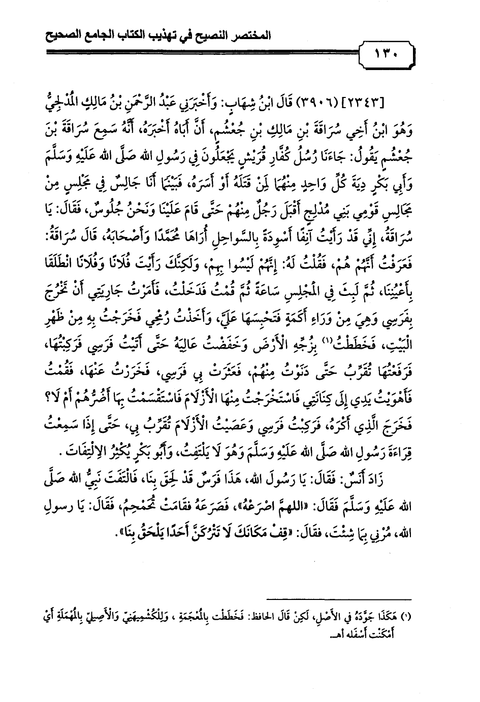 [2343] (3906) قَالَ ابْنُ شِهَابٍ: وَأَخْبَرَنِي عَبْدُ الرَّحْمَنِ بْنُ مَالِكٍ الْمُدْلِجِيُّ وَهُوَ ابْنُ أَخِي سُرَاقَةَ بْنِ مَالِكِ بْنِ جُعْشُمٍ، أَنَّ أَبَاهُ أَخْبَرَهُ، أَنَّهُ سَمِعَ سُرَاقَةَ بْنَ جُعْشُمٍ يَقُولُ: جَاءَنَا رُسُلُ كُفَّارِ قُرَيْشٍ يَجْعَلُونَ فِي رَسُولِ الله صَلَّى الله عَلَيْهِ وَسَلَّمَ وَأَبِي بَكْرٍ دِيَةَ كُلِّ وَاحِدٍ مِنْهُمَا لِمَنْ قَتَلَهُ أَوْ أَسَرَهُ، فَبَيْنَمَا أَنَا جَالِسٌ فِي مَجْلِسٍ مِنْ مَجَالِسِ قَوْمِي بَنِي مُدْلِجٍ أَقْبَلَ رَجُلٌ مِنْهُمْ حَتَّى قَامَ عَلَيْنَا وَنَحْنُ جُلُوسٌ، فَقَالَ: يَا سُرَاقَةُ، إِنِّي قَدْ رَأَيْتُ آنِفًا أَسْوِدَةً بِالسَّواحِلِ أُرَاهَا مُحَمَّدًا وَأَصْحَابَهُ، قَالَ سُرَاقَةُ: فَعَرَفْتُ أَنَّهُمْ هُمْ، فَقُلْتُ لَهُ: إِنَّهُمْ لَيْسُوا بِهِمْ، وَلَكِنَّكَ رَأَيْتَ فُلَانًا وَفُلَانًا انْطَلَقَا بِأَعْيُنِنَا، ثُمَّ لَبِثَ فِي الْمَجْلِسِ سَاعَةً ثُمَّ قُمْتُ فَدَخَلْتُ، فَأَمَرْتُ جَارِيَتِي أَنْ تَخْرُجَ بِفَرَسِي وَهِيَ مِنْ وَرَاءِ أَكَمَةٍ فَتَحْبِسَهَا عَلَيَّ، وَأَخَذْتُ رُمْحِي فَخَرَجْتُ بِهِ مِنْ ظَهْرِ الْبَيْتِ، فَخَطَطْتُ (¬1) بِزُجِّهِ الْأَرْضَ وَخَفَضْتُ عَالِيَهُ حَتَّى أَتَيْتُ فَرَسِي فَرَكِبْتُهَا, فَرَفَعْتُهَا تُقَرِّبُ حَتَّى دَنَوْتُ مِنْهُمْ، فَعَثَرَتْ بِي فَرَسِي، فَخَرَرْتُ عَنْهَا، فَقُمْتُ فَأَهْوَيْتُ يَدِي إِلَى كِنَانَتِي فَاسْتَخْرَجْتُ مِنْهَا الْأَزْلَامَ فَاسْتَقْسَمْتُ بِهَا أَضُرُّهُمْ أَمْ لَا؟ فَخَرَجَ الَّذِي أَكْرَهُ، فَرَكِبْتُ فَرَسِي وَعَصَيْتُ الْأَزْلَامَ تُقَرِّبُ بِي، حَتَّى إِذَا سَمِعْتُ قِرَاءَةَ رَسُولِ الله صَلَّى الله عَلَيْهِ وَسَلَّمَ وَهُوَ لَا يَلْتَفِتُ، وَأَبُو بَكْرٍ يُكْثِرُ الِالْتِفَاتَ.