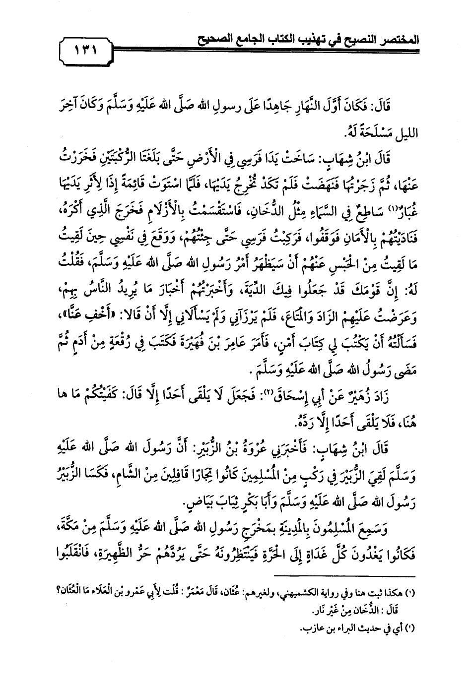 قَالَ ابْنُ شِهَابٍ: فَأَخْبَرَنِي عُرْوَةُ بْنُ الزُّبَيْرِ: أَنَّ رَسُولَ الله صَلَّى الله عَلَيْهِ وَسَلَّمَ لَقِيَ الزُّبَيْرَ فِي رَكْبٍ مِنْ الْمُسْلِمِينَ كَانُوا تِجَارًا قَافِلِينَ مِنْ الشَّامِ, فَكَسَا الزُّبَيْرُ رَسُولَ الله صَلَّى الله عَلَيْهِ وَسَلَّمَ وَأَبَا بَكْرٍ ثِيَابَ بَيَاضٍ.