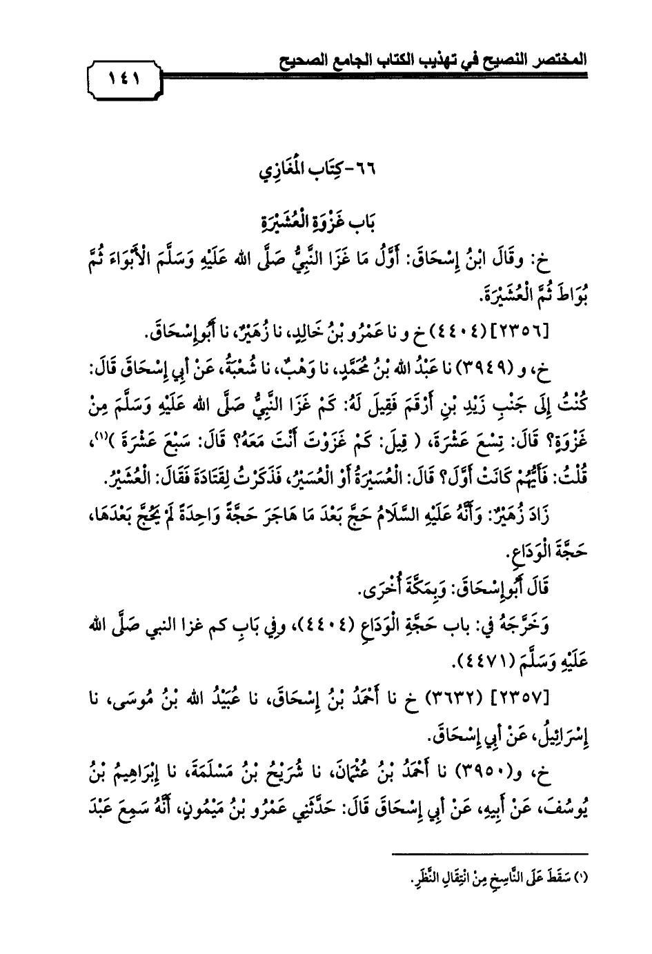 خ, و (3949) نا عَبْدُ الله بْنُ مُحَمَّدٍ, نا وَهْبٌ, نا شُعْبَةُ, عَنْ أبِي إِسْحَاقَ قَالَ: كُنْتُ إِلَى جَنْبِ زَيْدِ بْنِ أَرْقَمَ فَقِيلَ لَهُ: كَمْ غَزَا النَّبِيُّ صَلَّى الله عَلَيْهِ وَسَلَّمَ مِنْ غَزْوَةٍ؟ قَالَ: تِسْعَ عَشْرَةَ، (قِيلَ: كَمْ غَزَوْتَ أَنْتَ مَعَهُ؟ قَالَ: سَبْعَ عَشْرَةَ) (¬1) , قُلْتُ: فَأَيُّهُمْ كَانَتْ أَوَّلَ؟ قَالَ: الْعُسَيْرَةُ أَوْ الْعُسَيْرُ، فَذَكَرْتُ لِقَتَادَةَ فَقَالَ: الْعُشَيْرُ.