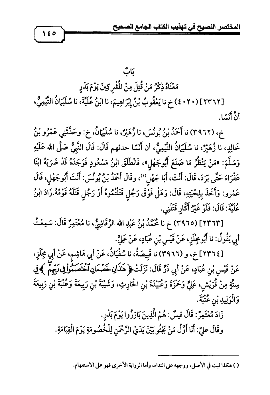 خ, (3962) نا أَحْمَدُ بْنُ يُونُسَ, نا زُهَيْرٌ, نا سُلَيْمَانُ, خ: وحَدَّثَنِي عَمْرُو بْنُ خَالِدٍ, نا زُهَيْرٌ, نا سُلَيْمَانُ التَّيْمِيُّ, أن أَنَسًا حدثهم قَالَ: قَالَ النَّبِيُّ صَلَّى الله عَلَيْهِ وَسَلَّمَ: «مَنْ يَنْظُرُ مَا صَنَعَ أَبُوجَهْلٍ» , فَانْطَلَقَ ابْنُ مَسْعُودٍ فَوَجَدَهُ قَدْ ضَرَبَهُ ابْنَا عَفْرَاءَ حَتَّى بَرَدَ، قَالَ: أَنْتَ, أَبَا جَهْلٍ (¬1)، وقَالَ أَحْمَدُ بْنُ يُونُسَ: أَنْتَ أَبُوجَهْلٍ، قَالَ عَمْرو: وَأَخَذَ بِلِحْيَتِهِ، قَالَ: وَهَلْ فَوْقَ رَجُلٍ قَتَلْتُمُوهُ أَوْ رَجُلٍ قَتَلَهُ قَوْمُهُ. زَادَ ابْنُ عُلَيَّةَ: قَالَ: فَلَوْ غَيْرُ أَكَّارٍ قَتَلَنِي.