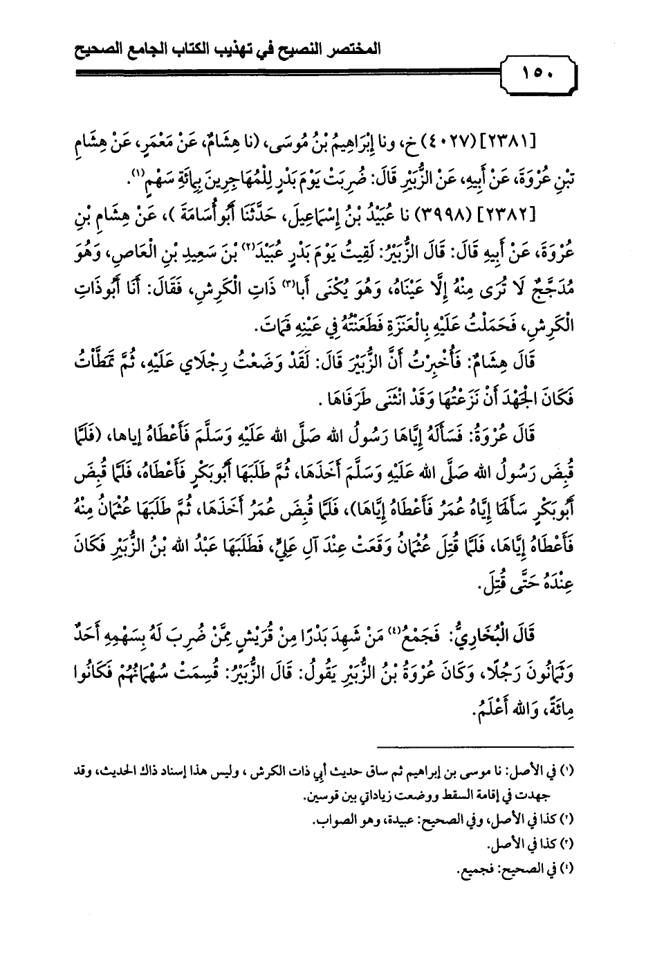 [2381] (4027) خ, ونا إِبْرَاهِيمُ بْنُ مُوسَى, (نا هِشَامٌ, عَنْ مَعْمَرٍ, عَنْ هِشَامِ بْنِ عُرْوَةَ, عَنْ أَبِيهِ, عَنْ الزُّبَيْرِ قَالَ: ضُرِبَتْ يَوْمَ بَدْرٍ لِلْمُهَاجِرِينَ بِمِائَةِ سَهْمٍ (¬1).