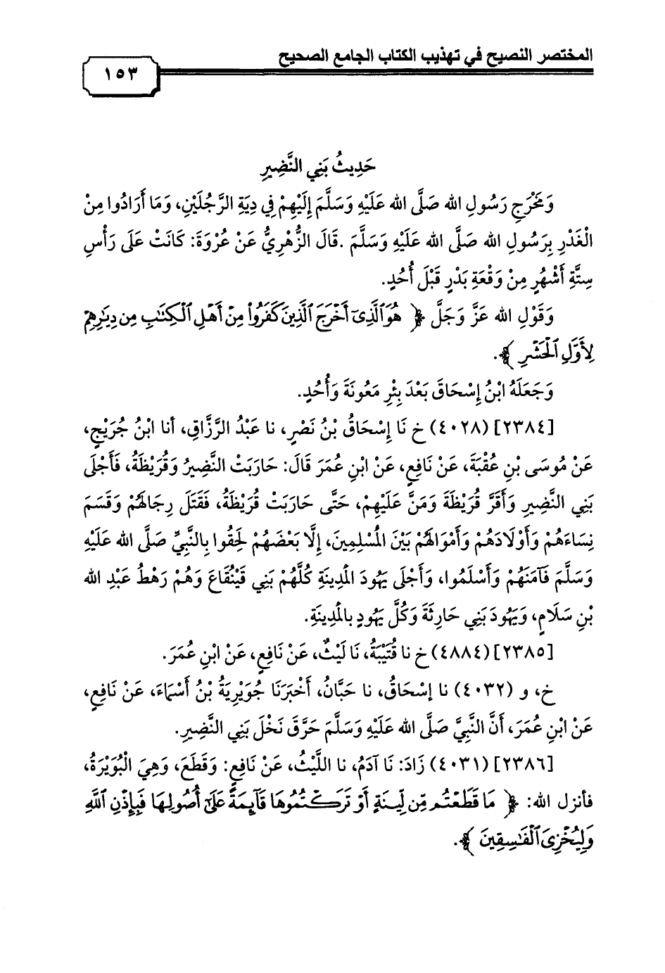 خ, و (4032) نا إسْحَاقُ, نا حَبَّانُ, أَخْبَرَنَا جُوَيْرِيَةُ بْنُ أَسْمَاءَ, عَنْ نَافِعٍ, عَنْ ابْنِ عُمَرَ, أَنَّ النَّبِيَّ صَلَّى الله عَلَيْهِ وَسَلَّمَ حَرَّقَ نَخْلَ بَنِي النَّضِيرِ.