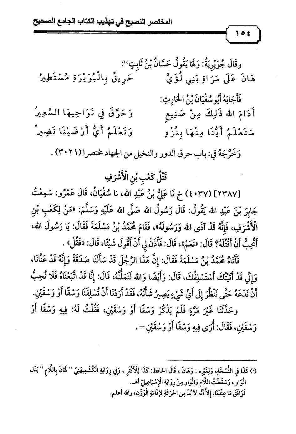 [2387] (4037) خ نَا عَلِيُّ بْنُ عَبْدِ الله, نا سُفْيَانُ, قَالَ عَمْرٌو: سَمِعْتُ جَابِرَ بْنَ عَبْدِ الله يَقُولُ: قَالَ رَسُولُ الله صَلَّى الله عَلَيْهِ وَسَلَّمَ: «مَنْ لِكَعْبِ بْنِ الْأَشْرَفِ، فَإِنَّهُ قَدْ آذَى الله وَرَسُولَهُ» , فَقَامَ مُحَمَّدُ بْنُ مَسْلَمَةَ فَقَالَ: يَا رَسُولَ الله، أَتُحِبُّ أَنْ أَقْتُلَهُ؟ قَالَ: «نَعَمْ» , قَالَ: فَأْذَنْ لِي أَنْ أَقُولَ شَيْئًا، قَالَ: «فَقُلْ».