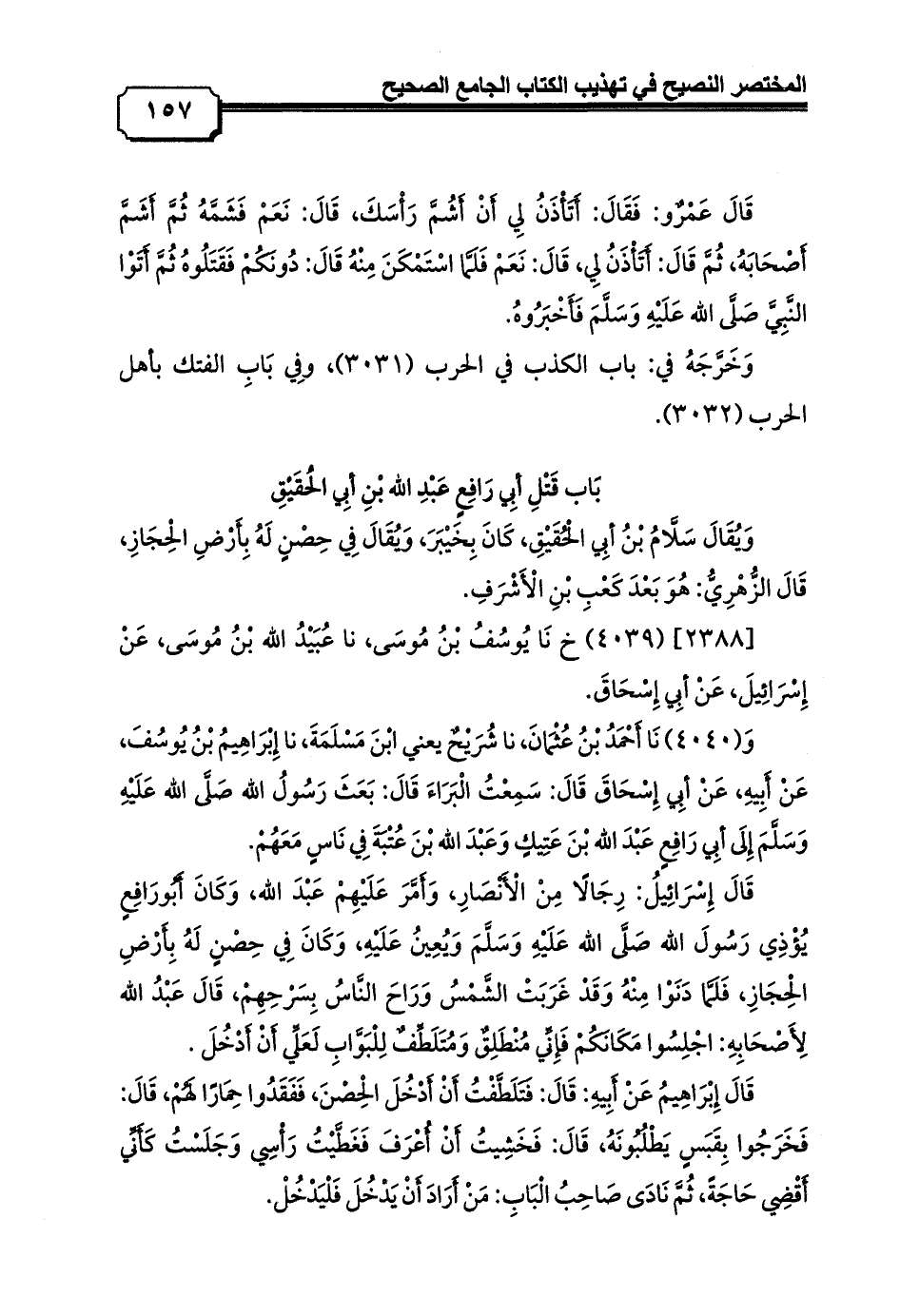 وَ (4040) نَا أَحْمَدُ بْنُ عُثْمَانَ, نا شُرَيْحٌ يعني ابْنَ مَسْلَمَةَ, نا إِبْرَاهِيمُ بْنُ يُوسُفَ, عَنْ أَبِيهِ, عَنْ أبِي إِسْحَاقَ قَالَ: سَمِعْتُ الْبَرَاءَ قَالَ: بَعَثَ رَسُولُ الله صَلَّى الله عَلَيْهِ وَسَلَّمَ إِلَى أبِي رَافِعٍ عَبْدَ الله بْنَ عَتِيكٍ وَعَبْدَ الله بْنَ عُتْبَةَ فِي نَاسٍ مَعَهُمْ.