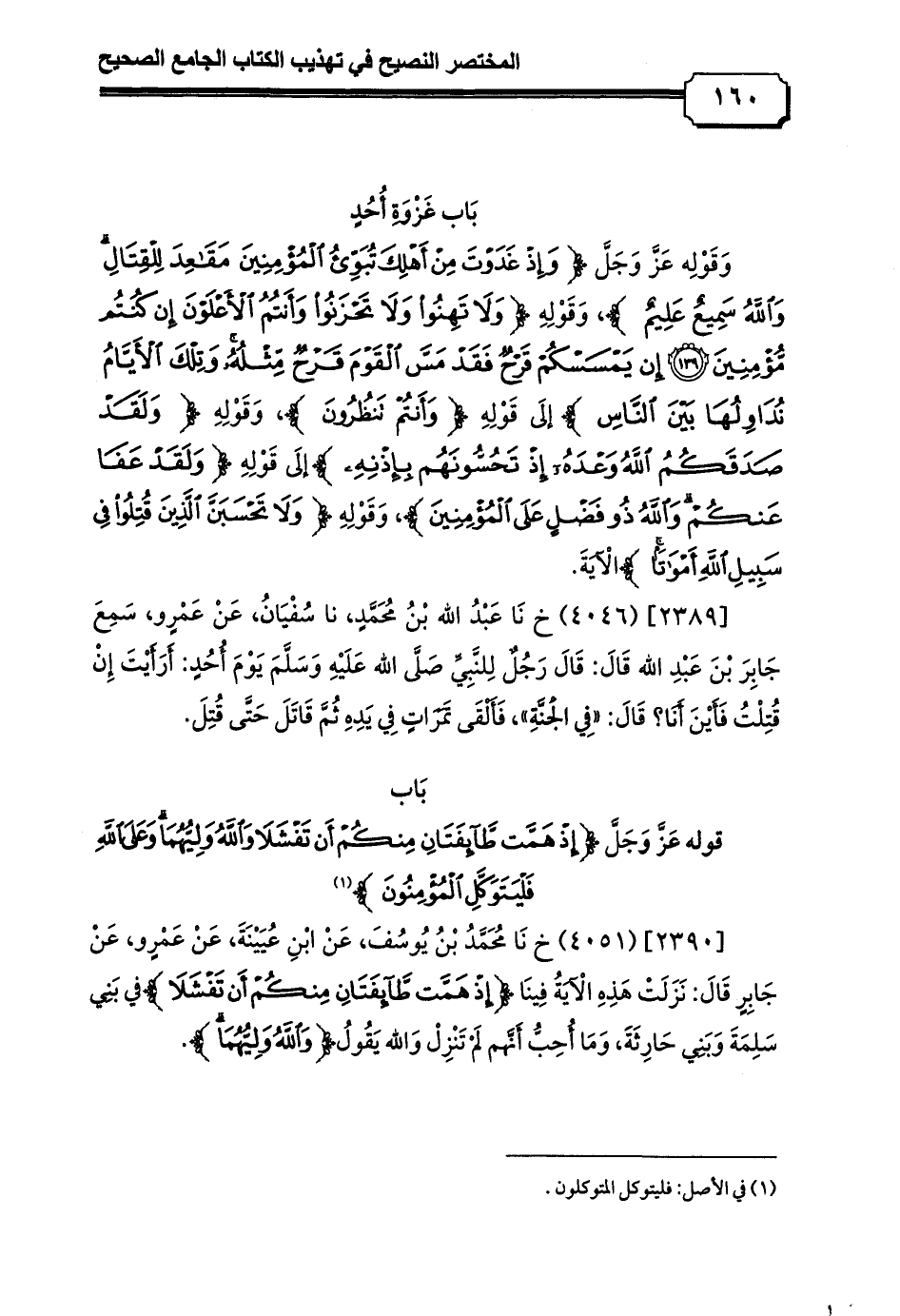 [2390] (4051) خ نَا مُحَمَّدُ بْنُ يُوسُفَ, عَنْ ابْنِ عُيَيْنَةَ, عَنْ عَمْرٍو, عَنْ جَابِرٍ قَالَ: نَزَلَتْ هَذِهِ الْآيَةُ فِينَا {إِذْ هَمَّتْ طَائِفَتَانِ مِنْكُمْ أَنْ تَفْشَلَا} في بَنِي سَلِمَةَ وَبَنِي حَارِثَةَ, وَمَا أُحِبُّ أَنَّهم لَمْ تَنْزِلْ وَالله يَقُولُ {وَاللَّهُ وَلِيُّهُمَا}.
