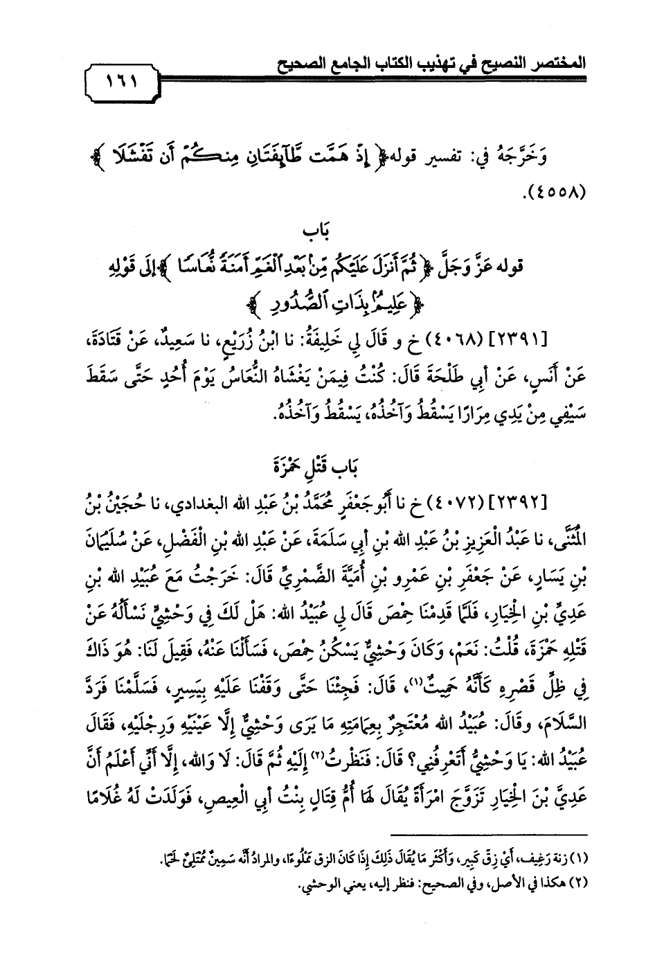 [2392] (4072) خ نا أَبُوجَعْفَرٍ مُحَمَّدُ بْنُ عَبْدِ الله البغدادي, نا حُجَيْنُ بْنُ الْمُثَنَّى, نا عَبْدُ الْعَزِيزِ بْنُ عَبْدِ الله بْنِ أبِي سَلَمَةَ, عَنْ عَبْدِ الله بْنِ الْفَضْلِ, عَنْ سُلَيْمَانَ بْنِ يَسَارٍ, عَنْ جَعْفَرِ بْنِ عَمْرِو بْنِ أُمَيَّةَ الضَّمْرِيِّ قَالَ: خَرَجْتُ مَعَ عُبَيْدِ الله بْنِ عَدِيِّ بْنِ الْخِيَارِ، فَلَمَّا قَدِمْنَا حِمْصَ قَالَ لِي عُبَيْدُ الله: هَلْ لَكَ فِي وَحْشِيٍّ نَسْأَلُهُ عَنْ قَتْلِهِ حَمْزَةَ، قُلْتُ: نَعَمْ، وَكَانَ وَحْشِيٌّ يَسْكُنُ حِمْصَ، فَسَأَلْنَا عَنْهُ، فَقِيلَ لَنَا: هُوَ ذَاكَ فِي ظِلِّ قَصْرِهِ كَأَنَّهُ حَمِيتٌ (¬1)، قَالَ: فَجِئْنَا حَتَّى وَقَفْنَا عَلَيْهِ بِيَسِيرٍ، فَسَلَّمْنَا فَرَدَّ السَّلَامَ، وقَالَ: عُبَيْدُ الله مُعْتَجِرٌ بِعِمَامَتِهِ مَا يَرَى وَحْشِيٌّ إِلَّا عَيْنَيْهِ وَرِجْلَيْهِ، فَقَالَ عُبَيْدُ الله: يَا وَحْشِيُّ أَتَعْرِفُنِي؟ قَالَ: فَنَظْرتُ (¬2)