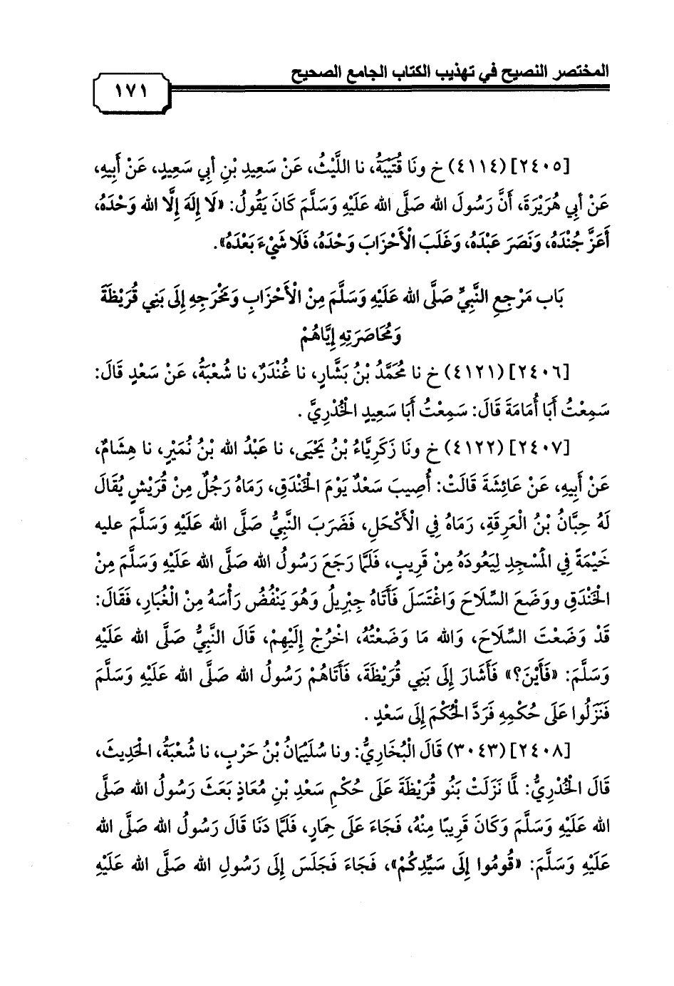 [2407] (4122) خ ونَا زَكَرِيَّاءُ بْنُ يَحْيَى, نا عَبْدُ الله بْنُ نُمَيْرٍ, نا هِشَامٌ, عَنْ أَبِيهِ, عَنْ عَائِشَةَ قَالَتْ: أُصِيبَ سَعْدٌ يَوْمَ الْخَنْدَقِ، رَمَاهُ رَجُلٌ مِنْ قُرَيْشٍ يُقَالَ لَهُ حِبَّانُ بْنُ الْعَرِقَةِ، رَمَاهُ فِي الْأَكْحَلِ، فَضَرَبَ النَّبِيُّ صَلَّى الله عَلَيْهِ وَسَلَّمَ عليه خَيْمَةً فِي الْمَسْجِدِ لِيَعُودَهُ مِنْ قَرِيبٍ، فَلَمَّا رَجَعَ رَسُولُ الله صَلَّى الله عَلَيْهِ وَسَلَّمَ مِنْ الْخَنْدَقِ ووَضَعَ السِّلَاحَ وَاغْتَسَلَ فَأَتَاهُ جِبْرِيلُ وَهُوَ يَنْفُضُ رَأْسَهُ مِنْ الْغُبَارِ، فَقَالَ: قَدْ وَضَعْتَ السِّلَاحَ، وَالله مَا وَضَعْتُهُ، اخْرُجْ إِلَيْهِمْ، قَالَ النَّبِيُّ صَلَّى الله عَلَيْهِ وَسَلَّمَ: «فَأَيْنَ؟» فَأَشَارَ إِلَى بَنِي قُرَيْظَةَ، فَأَتَاهُمْ رَسُولُ الله صَلَّى الله عَلَيْهِ وَسَلَّمَ فَنَزَلُوا عَلَى حُكْمِهِ فَرَدَّ الْحُكْمَ إِلَى سَعْدٍ.