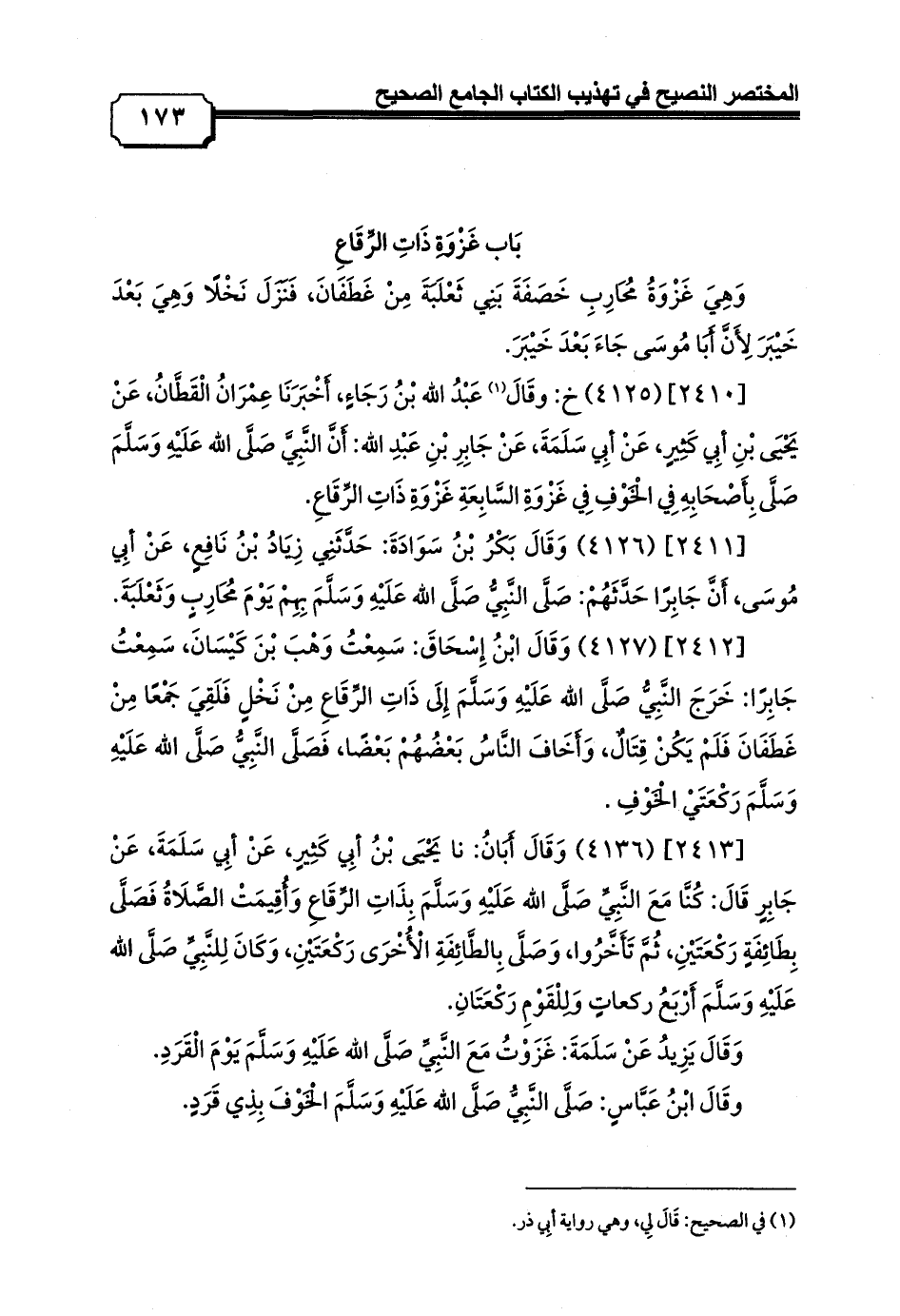 [2410] (4125) خ: وقَالَ (¬1) عَبْدُ الله بْنُ رَجَاءٍ, أَخْبَرَنَا عِمْرَانُ الْقَطَّانُ, عَنْ يَحْيَى بْنِ أبِي كَثِيرٍ, عَنْ أبِي سَلَمَةَ, عَنْ جَابِرِ بْنِ عَبْدِ الله: أَنَّ النَّبِيَّ صَلَّى الله عَلَيْهِ وَسَلَّمَ صَلَّى بِأَصْحَابِهِ فِي الْخَوْفِ فِي غَزْوَةِ السَّابِعَةِ غَزْوَةِ ذَاتِ الرِّقَاعِ.