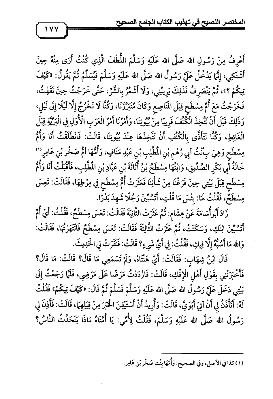 أَعْرِفُ مِنْ رَسُولِ الله صَلَّى الله عَلَيْهِ وَسَلَّمَ اللُّطْفَ الَّذِي كُنْتُ أَرَى مِنْهُ حِينَ أَشْتَكِي، إِنَّمَا يَدْخُلُ عَلَيَّ رَسُولُ الله صَلَّى الله عَلَيْهِ وَسَلَّمَ فَيُسَلِّمُ ثُمَّ يَقُولُ: «كَيْفَ تِيكُمْ؟» , ثُمَّ يَنْصَرِفُ فَذَلِكَ يَرِيبُنِي, وَلَا أَشْعُرُ بِالشَّرِّ، حَتَّى خَرَجْتُ حِينَ نَقَهْتُ، فَخَرَجْتُ مَعَ أُمِّ مِسْطَحٍ قِبَلَ الْمَنَاصِعِ وَكَانَ مُتَبَرَّزَنَا، وَكُنَّا لَا نَخْرُجُ إِلَّا لَيْلًا إِلَى لَيْلٍ، وَذَلِكَ قَبْلَ أَنْ نَتَّخِذَ الْكُنُفَ قَرِيبًا مِنْ بُيُوتِنَا، وَأَمْرُنَا أَمْرُ الْعَرَبِ الْأُوَلِ فِي الْبَرِّيَّةِ قِبَلَ الْغَائِطِ, وَكُنَّا نَتَأَذَّى بِالْكُنُفِ أَنْ نَتَّخِذَهَا عِنْدَ بُيُوتِنَا, قَالَتْ: فَانْطَلَقْتُ أَنَا وَأُمُّ مِسْطَحٍ وَهِيَ بِْنْتُ أبِي رُهْمِ بْنِ الْمُطَّلِبِ بْنِ عَبْدِ مَنَافٍ، وَأُمُّهَا أمُّ صَخْر بْنِ عَامِرٍ (¬1) خَالَةُ أبِي بَكْرٍ الصِّدِّيقِ، وَابْنُهَا مِسْطَحُ بْنُ أُثَاثَةَ بْنِ عَبَّادِ بْنِ الْمُطَّلِبِ، فَأَقْبَلْتُ أَنَا وَأُمُّ مِسْطَحٍ قِبَلَ بَيْتِي حِينَ فَرَغْنَا مِنْ شَأْنِنَا فَعَثَرَتْ أُمُّ مِسْطَحٍ فِي مِرْطِهَا، فَقَالَتْ: تَعِسَ مِسْطَحٌ، فَقُلْتُ لَهَا: بِئْسَ مَا قُلْتِ، أَتَسُبِّينَ رَجُلًا شَهِدَ بَدْرًا.