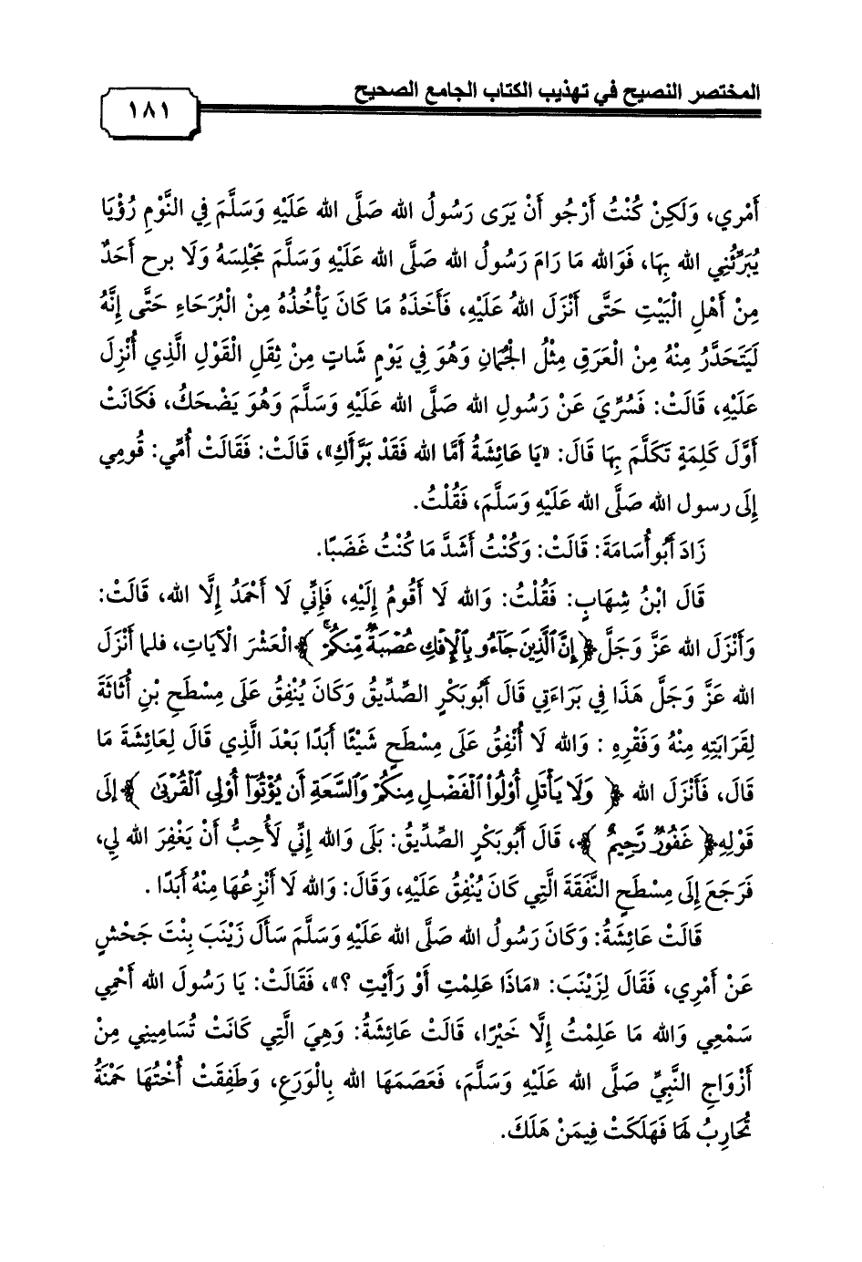 قَالَتْ عَائِشَةُ: وَكَانَ رَسُولُ الله صَلَّى الله عَلَيْهِ وَسَلَّمَ سَأَلَ زَيْنَبَ بِنْتَ جَحْشٍ عَنْ أَمْرِي، فَقَالَ لِزَيْنَبَ: «مَاذَا عَلِمْتِ أَوْ رَأَيْتِ؟»، فَقَالَتْ: يَا رَسُولَ الله أَحْمِي سَمْعِي وَالله مَا عَلِمْتُ إِلَّا خَيْرًا, قَالَتْ عَائِشَةُ: وَهِيَ الَّتِي كَانَتْ تُسَامِينِي مِنْ أَزْوَاجِ النَّبِيِّ صَلَّى الله عَلَيْهِ وَسَلَّمَ، فَعَصَمَهَا الله بِالْوَرَعِ، وَطَفِقَتْ أُخْتُهَا حَمْنَةُ تُحَارِبُ لَهَا فَهَلَكَتْ فِيمَنْ هَلَكَ.