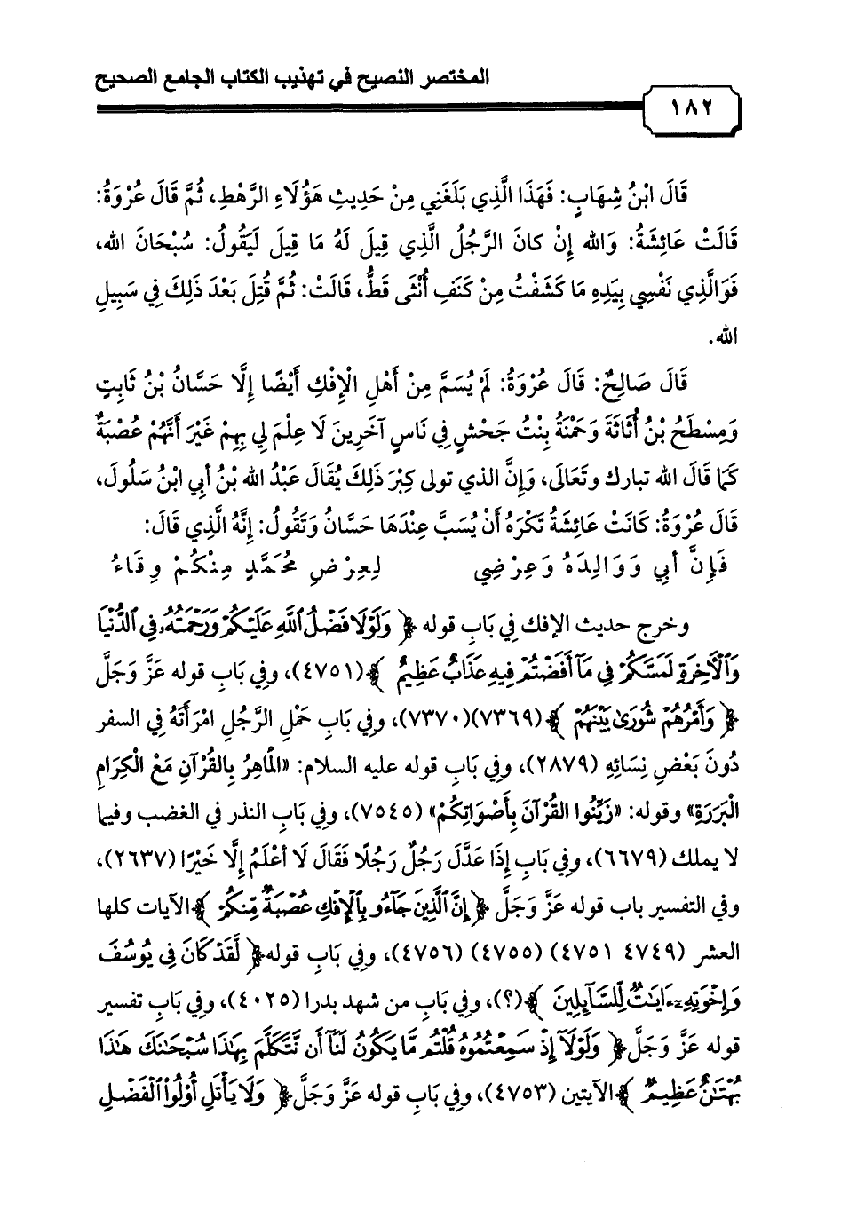 وخرج حديث الإفك فِي بَابِ قوله {وَلَوْلَا فَضْلُ اللَّهِ عَلَيْكُمْ وَرَحْمَتُهُ فِي الدُّنْيَا وَالْآخِرَةِ لَمَسَّكُمْ فِي مَا أَفَضْتُمْ فِيهِ عَذَابٌ عَظِيمٌ} (4751) , وفِي بَابِ قوله عَزَّ وَجَلَّ {وَأَمْرُهُمْ شُورَى بَيْنَهُمْ} (7369) (7370) , وفِي بَابِ حَمْلِ الرَّجُلِ امْرَأَتَهُ فِي السفر دُونَ بَعْضِ نِسَائِهِ (2879) , وفِي بَابِ قوله عليه السلام: «الْمَاهِرُ بِالقُرْآنِ مَعْ الْكِرَامِ الْبَرَرَةِ» وقوله: «زَيِّنُوا القُرْآنَ بِأَصْوَاتِكُمْ» (7545) , وفِي بَابِ النذر في الغضب وفيما لا يملك (6679) , وفِي بَابِ إِذَا عَدَّلَ رَجُلٌ رَجُلًا فَقَالَ لَا أعْلَمُ إِلَّا خَيْرًا (2637) , وفي التفسير باب قوله عَزَّ وَجَلَّ {إِنَّ الَّذِينَ جَاءُوا بِالْإِفْكِ عُصْبَةٌ مِنْكُمْ} الآيات كلها العشر (4749 4751) (4755) (4756) , وفِي بَابِ قوله {لَقَدْ كَانَ فِي يُوسُفَ وَإِخْوَتِهِ آيَاتٌ لِلسَّائِلِينَ} (؟)، وفِي بَابِ من شهد بدرا (4025)، وفِي بَابِ تفسير قوله عَزَّ وَجَلَّ {وَلَوْلَا إِذْ سَمِعْتُمُوهُ قُلْتُمْ مَا يَكُونُ لَنَا أَنْ نَتَكَلَّمَ بِهَذَا سُبْحَانَكَ هَذَا بُهْتَانٌ عَظِيمٌ} الآيتين (4753) , وفِي بَابِ قوله عَزَّ وَجَلَّ {وَلَا يَأْتَلِ أُولُو الْفَضْلِ