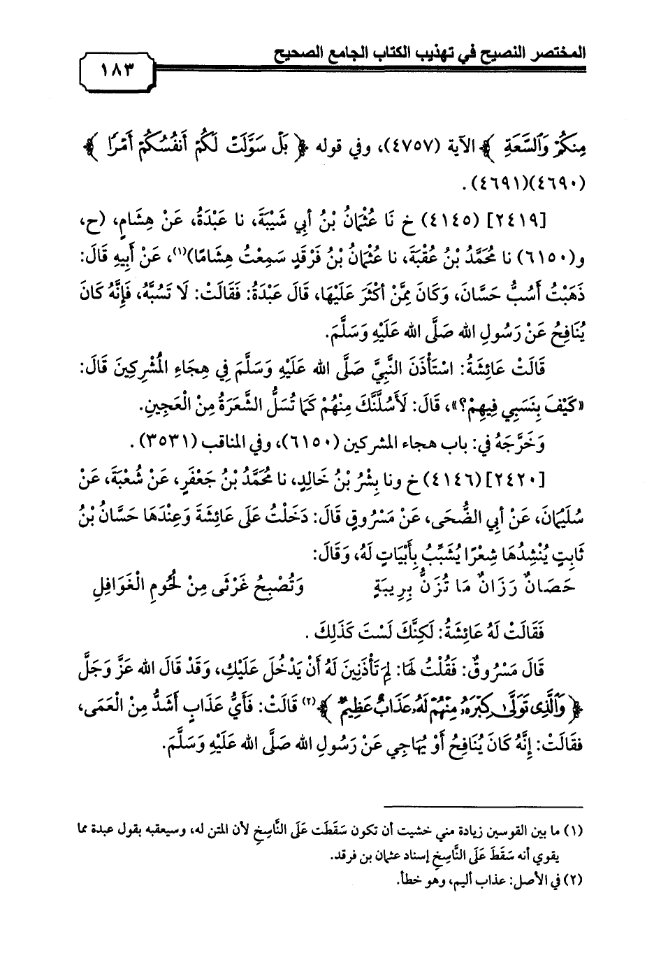 [2419] (4145) خ نَا عُثْمَانُ بْنُ أبِي شَيْبَةَ, نا عَبْدَةُ, عَنْ هِشَامٍ, (ح، و (6150) نا مُحَمَّدُ بْنُ عُقْبَةَ, نا عُثْمَانُ بْنُ فَرْقَدٍ سَمِعْتُ هِشَامًا) (¬1) , عَنْ أَبِيهِ قَالَ: ذَهَبْتُ أَسُبُّ حَسَّانَ, وَكَانَ مِمَّنْ أكْثَرَ عَلَيْهَا، قَالَ عَبْدَةُ: فَقَالَتْ: لَا تَسُبَّهُ, فَإِنَّهُ كَانَ يُنَافِحُ عَنْ رَسُولِ الله صَلَّى الله عَلَيْهِ وَسَلَّمَ.
