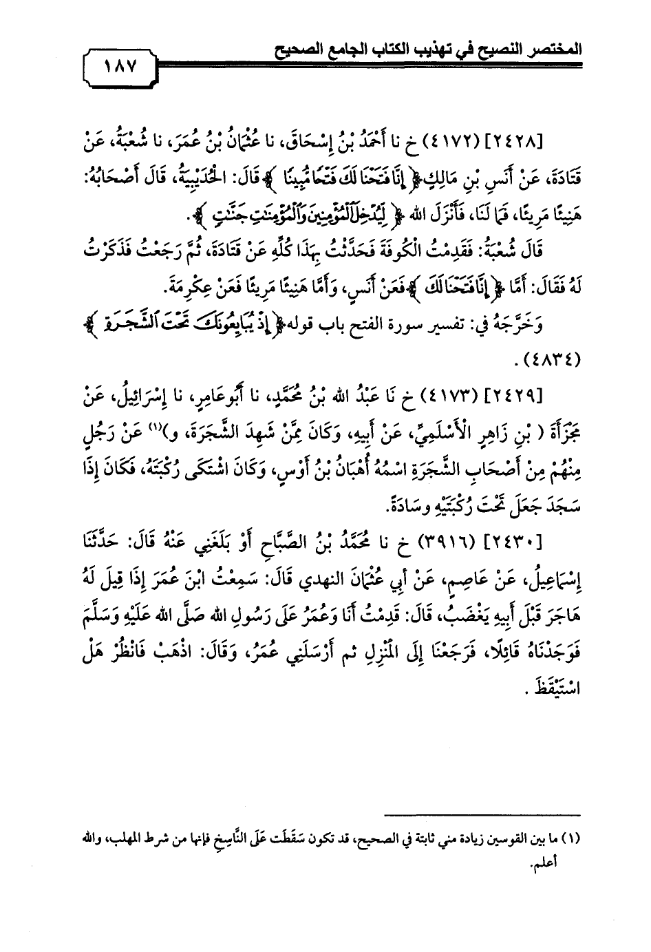 [2428] (4172) خ نا أَحْمَدُ بْنُ إِسْحَاقَ, نا عُثْمَانُ بْنُ عُمَرَ, نا شُعْبَةُ, عَنْ قَتَادَةَ, عَنْ أَنَسِ بْنِ مَالِكٍ {إِنَّا فَتَحْنَا لَكَ فَتْحًا مُبِينًا} قَالَ: الْحُدَيْبِيَةُ، قَالَ أَصْحَابُهُ: هَنِيئًا مَرِيئًا، فَمَا لَنَا، فَأَنْزَلَ الله {لِيُدْخِلَ الْمُؤْمِنِينَ وَالْمُؤْمِنَاتِ جَنَّاتٍ}.