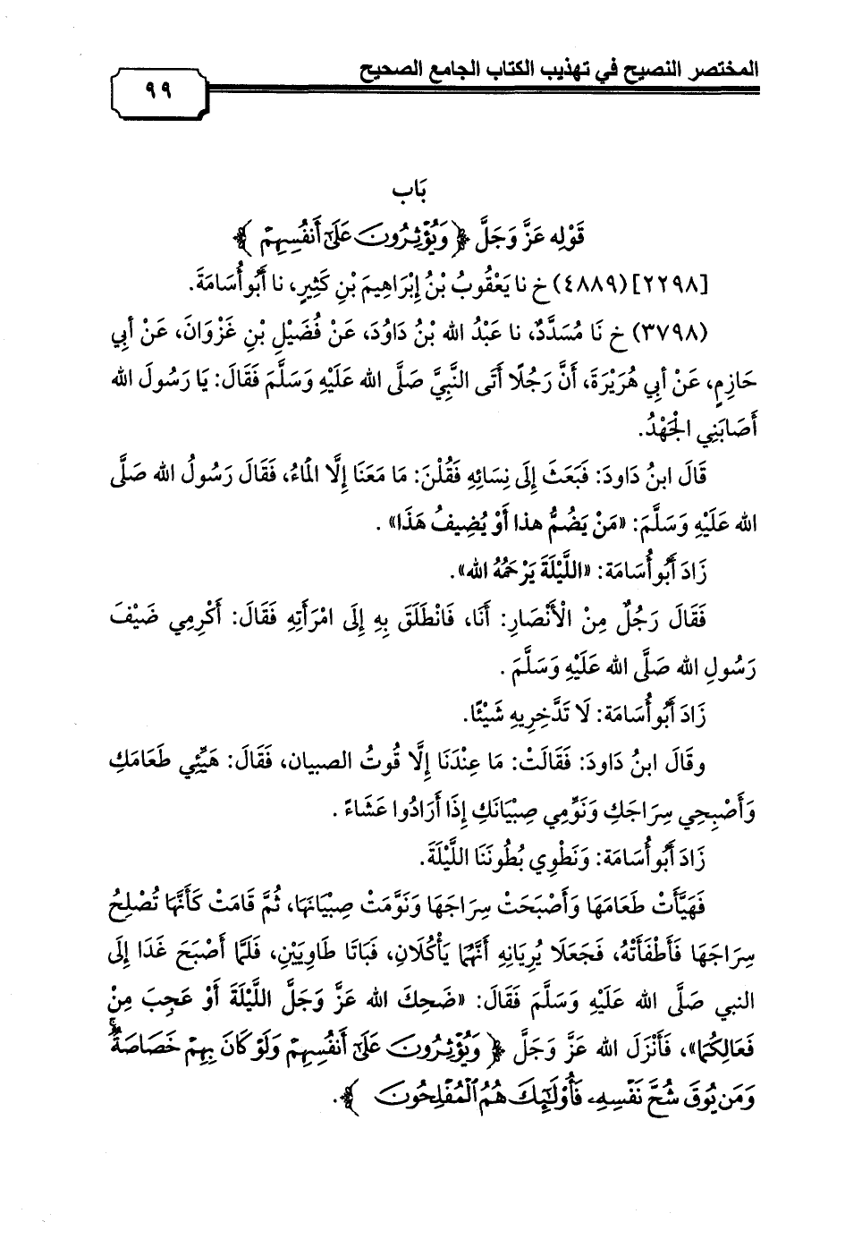 فَهَيَّأَتْ طَعَامَهَا وَأَصْبَحَتْ سِرَاجَهَا وَنَوَّمَتْ صِبْيَانَهَا، ثُمَّ قَامَتْ كَأَنَّهَا تُصْلِحُ سِرَاجَهَا فَأَطْفَأَتْهُ، فَجَعَلَا يُرِيَانِهِ أَنَّهُمَا يَأْكُلَانِ، فَبَاتَا طَاوِيَيْنِ، فَلَمَّا أَصْبَحَ غَدَا إِلَى النبي صَلَّى الله عَلَيْهِ وَسَلَّمَ فَقَالَ: «ضَحِكَ الله عَزَّ وَجَلَّ اللَّيْلَةَ أَوْ عَجِبَ مِنْ فَعَالِكُمَا» , فَأَنْزَلَ الله عَزَّ وَجَلَّ {وَيُؤْثِرُونَ عَلَى أَنْفُسِهِمْ وَلَوْ كَانَ بِهِمْ خَصَاصَةٌ وَمَنْ يُوقَ شُحَّ نَفْسِهِ فَأُولَئِكَ هُمُ الْمُفْلِحُونَ}.