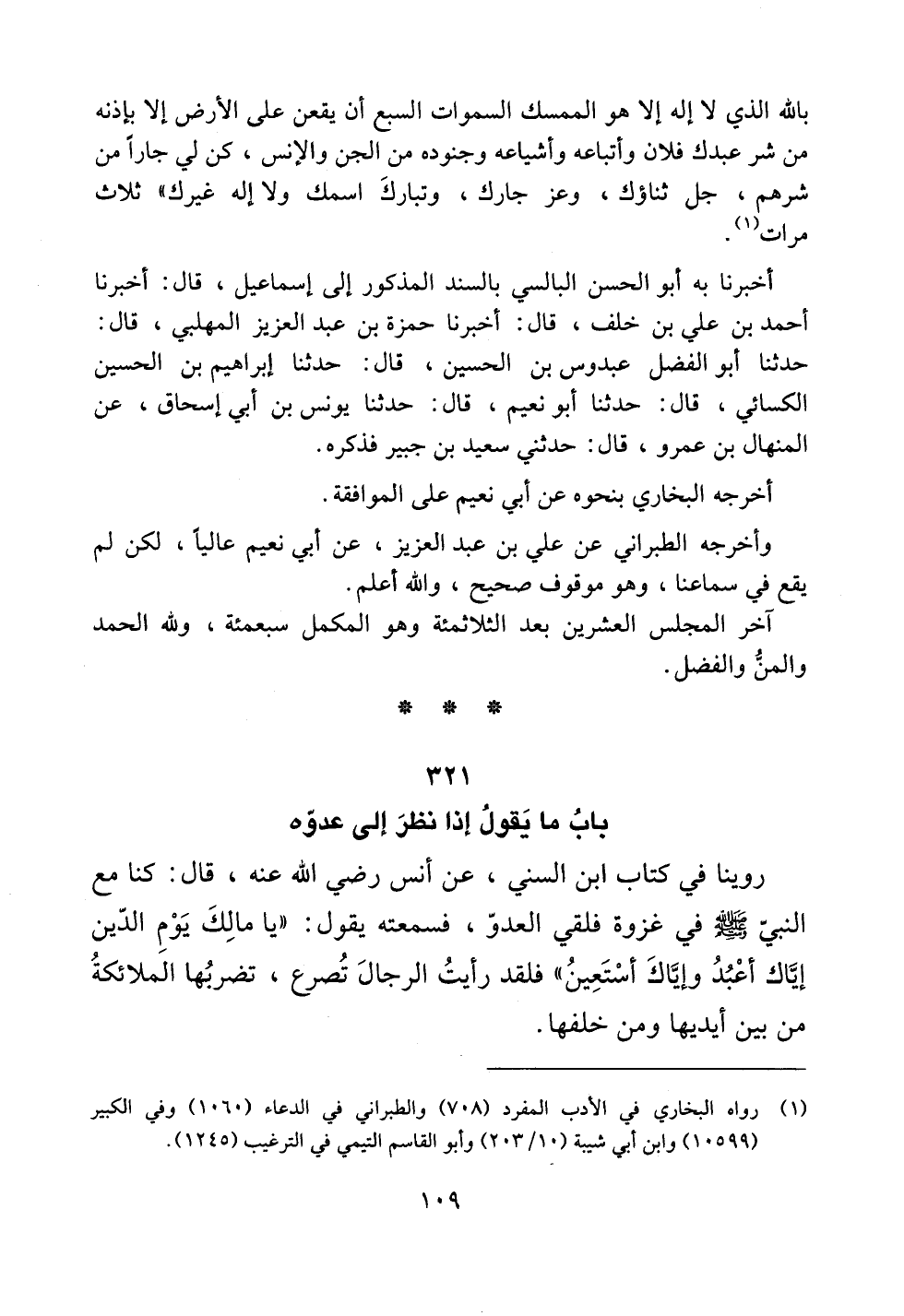 روينا في كتاب ابن السني، عن أنس رضي الله عنه، قال: كنا مع النبي صلى الله عليه وسلم في غزوة فلقي العدو، فسمعته يقول: ((يا مالك يوم الدين إياك أعبد وإياك أستعين)) فلقد رأيت الرجال تصرع، تضربها الملائكة من بين أيديها ومن خلفها.