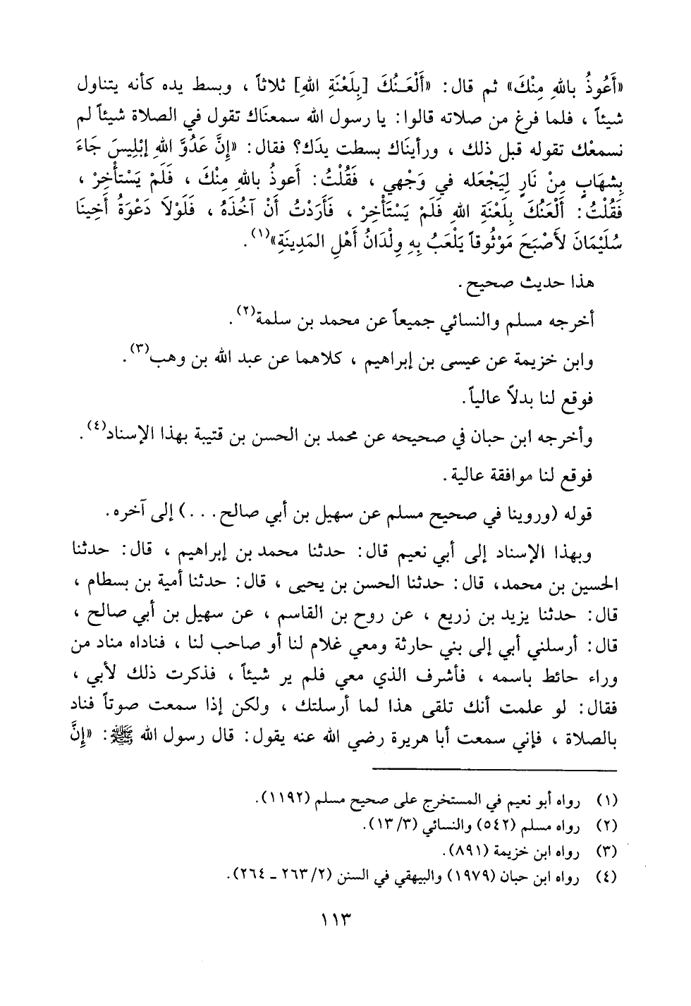 ((أعوذ بالله منك)) ثم قال: ((ألعنك [بلعنة الله] ثلاثاً، وبسط يده كأنه يتناول شيئاً، فلما فرغ من صلاته قالوا: يا رسول الله سمعناك تقول في الصلاة شيئاً لم نسمعك تقوله قبل ذلك، ورأيناك بسطت يدك؟ فقال: ((إن عدو الله إبليس جاء بشهابٍ من نارٍ ليجعله في وجهي، فقلت: أعوذ بالله منك، فلم يستأخر، فقلت: ألعنك بلعنة الله فلم يستأخر، فأردت أن آخذه، فلولا دعوة أخينا سليمان لأصبح موثوقاً يلعب به ولدان أهل المدينة)).